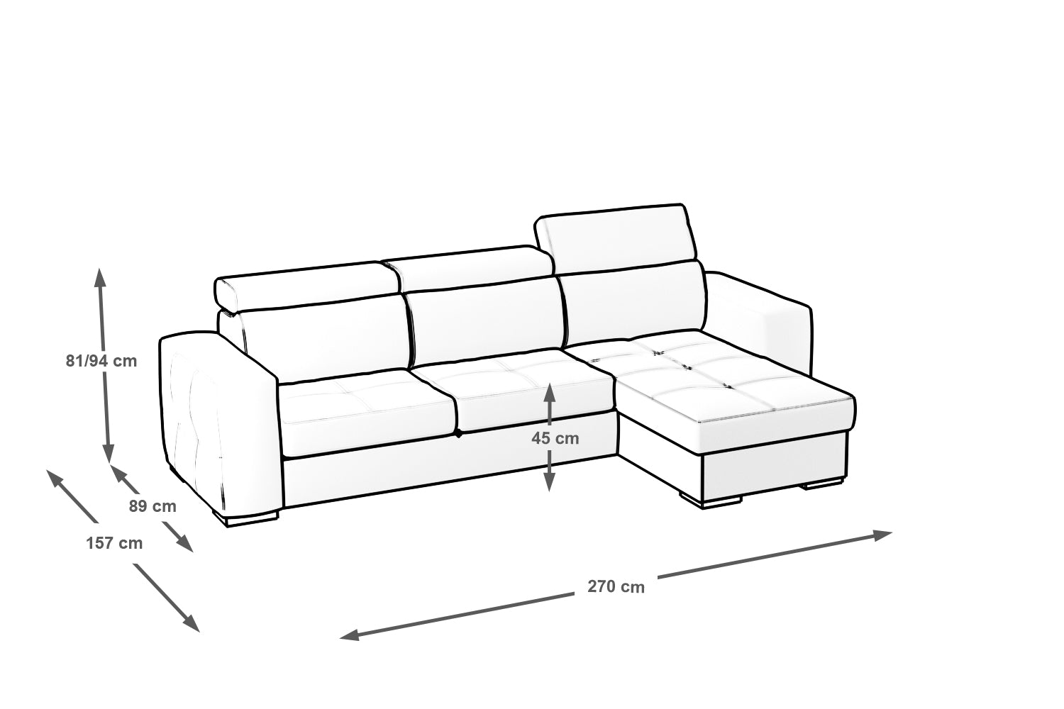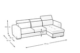 - Descrizione prodotto: questo divano è reversibile il che significa che la chaise longue puo’ essere posizionata sia a destra che a sinistra del divano. È perfetto per tutti gli ambienti ed ha dimensioni generose. È dotato di materasso ad estrazione complanare adatto per riposare le gambe durante i vostri momenti di relax, oppure a trasformarsi insieme alle sedute ed alla chaise longue in un letto rapido per ospiti dell'ultimo minuto. È dotato di una comoda chaise longue munita di un ampio contenitore interno utile a riporre cuscini, coperte, giocattoli e quant'altro. È dotato di comodi poggiatesta regolabili in diverse posizioni fino a quella verticale, le sue dimensioni massime d'ingombro sono 270x157cm e le sedute sono profonde ben 58cm. area letto 215x124cm.