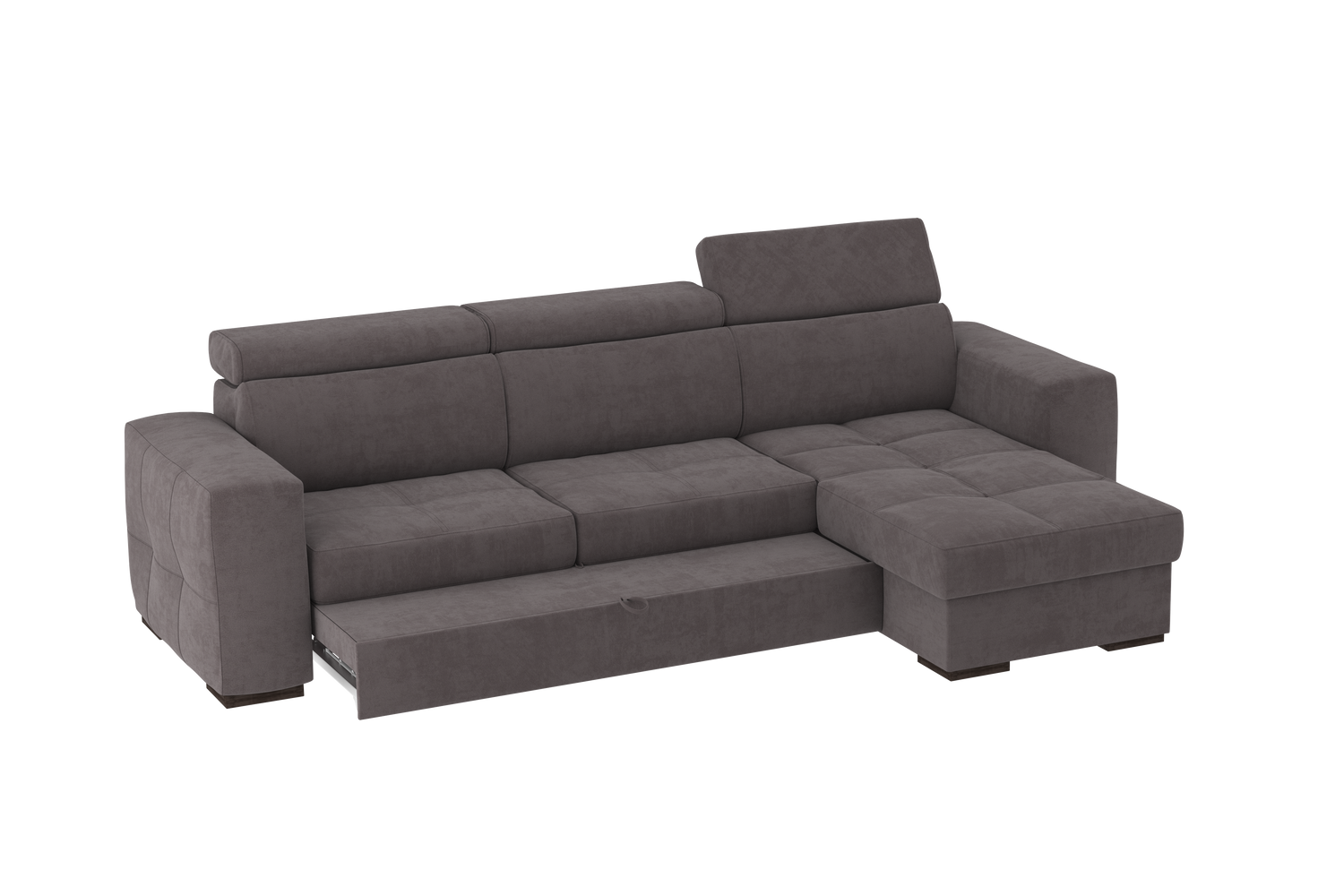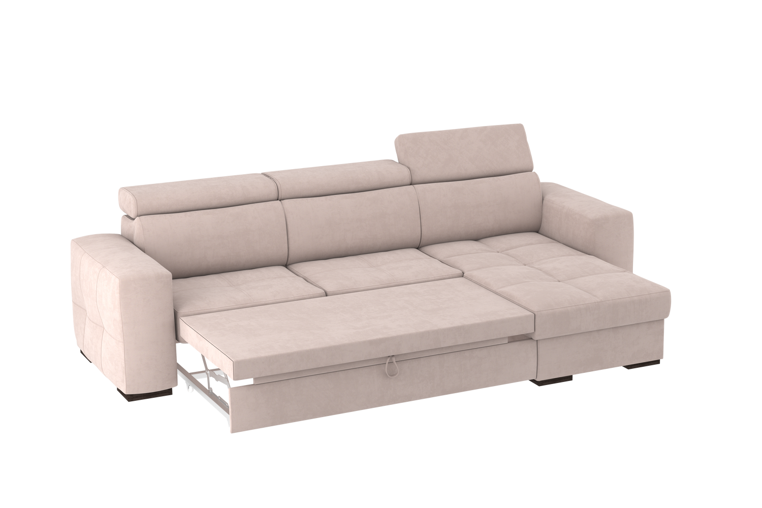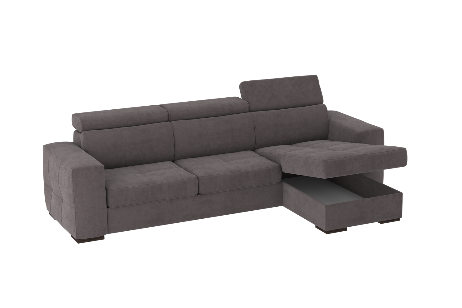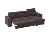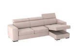 Un divano con chaise longue dalle dimensioni generose con uno stile moderno. Il suo meccanismo inferiore scorrevole consente di estrarre un ripiano che allineandosi alla seduta, crea un comodo letto o un semplice supporto poggiapiedi. La chaise longue è un capiente contenitore dove riporre cuscini e quant’altro. Il divano è prodotto con tessuto di alta qualità resistente all’abrasione. Interamente prodotto in UE.