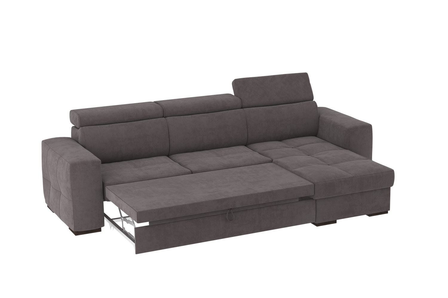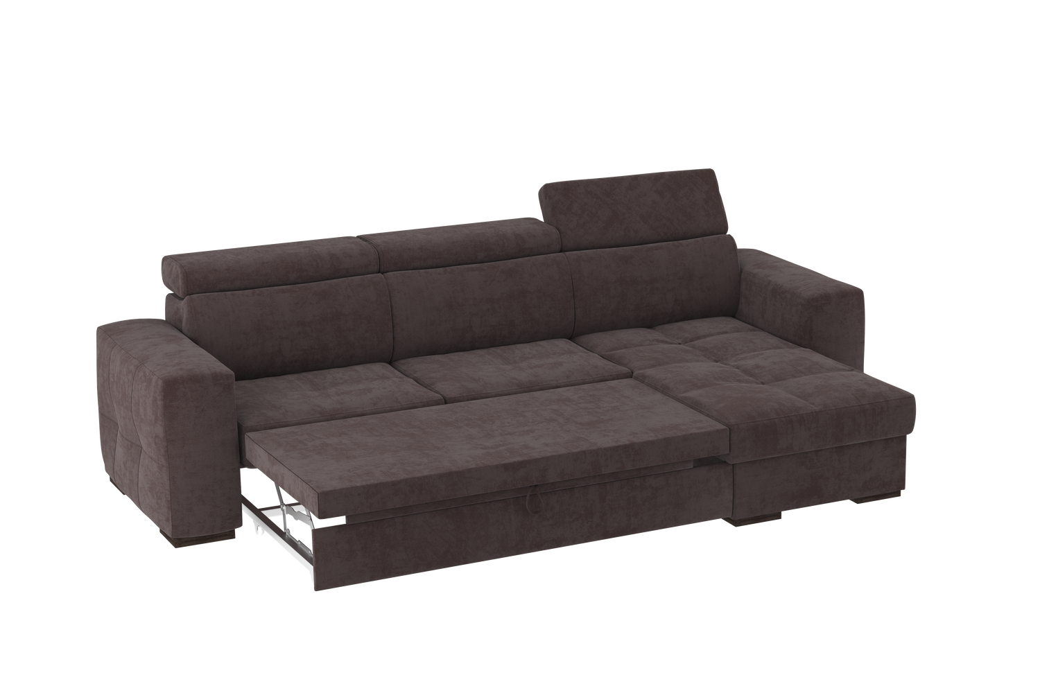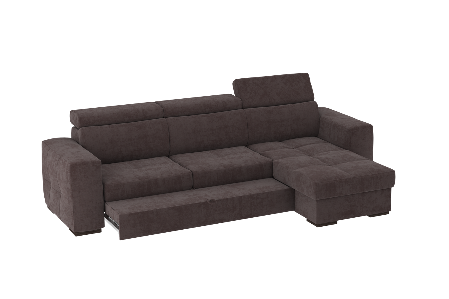 Un divano con chaise longue dalle dimensioni generose con uno stile moderno. Il suo meccanismo inferiore scorrevole consente di estrarre un ripiano che allineandosi alla seduta, crea un comodo letto o un semplice supporto poggiapiedi. La chaise longue è un capiente contenitore dove riporre cuscini e quant’altro. Il divano è prodotto con tessuto di alta qualità resistente all’abrasione. Interamente prodotto in UE.