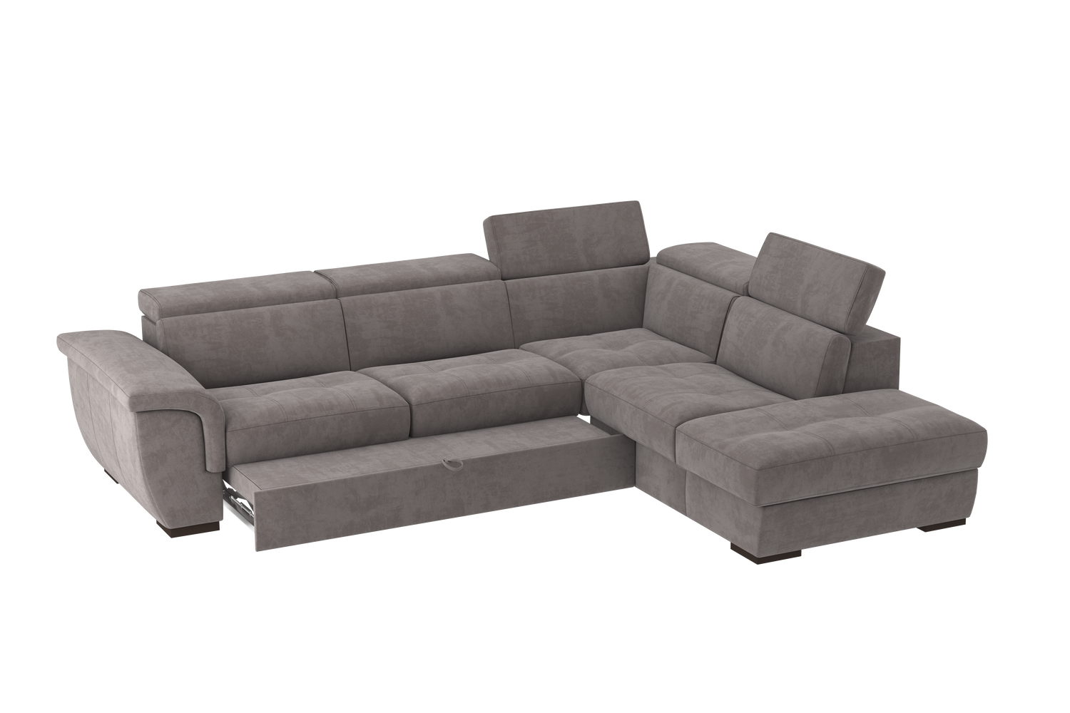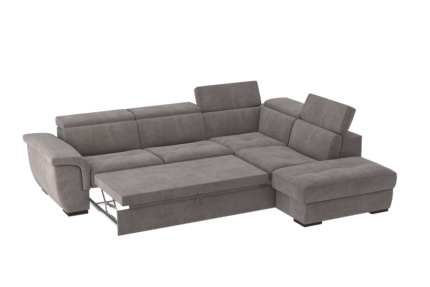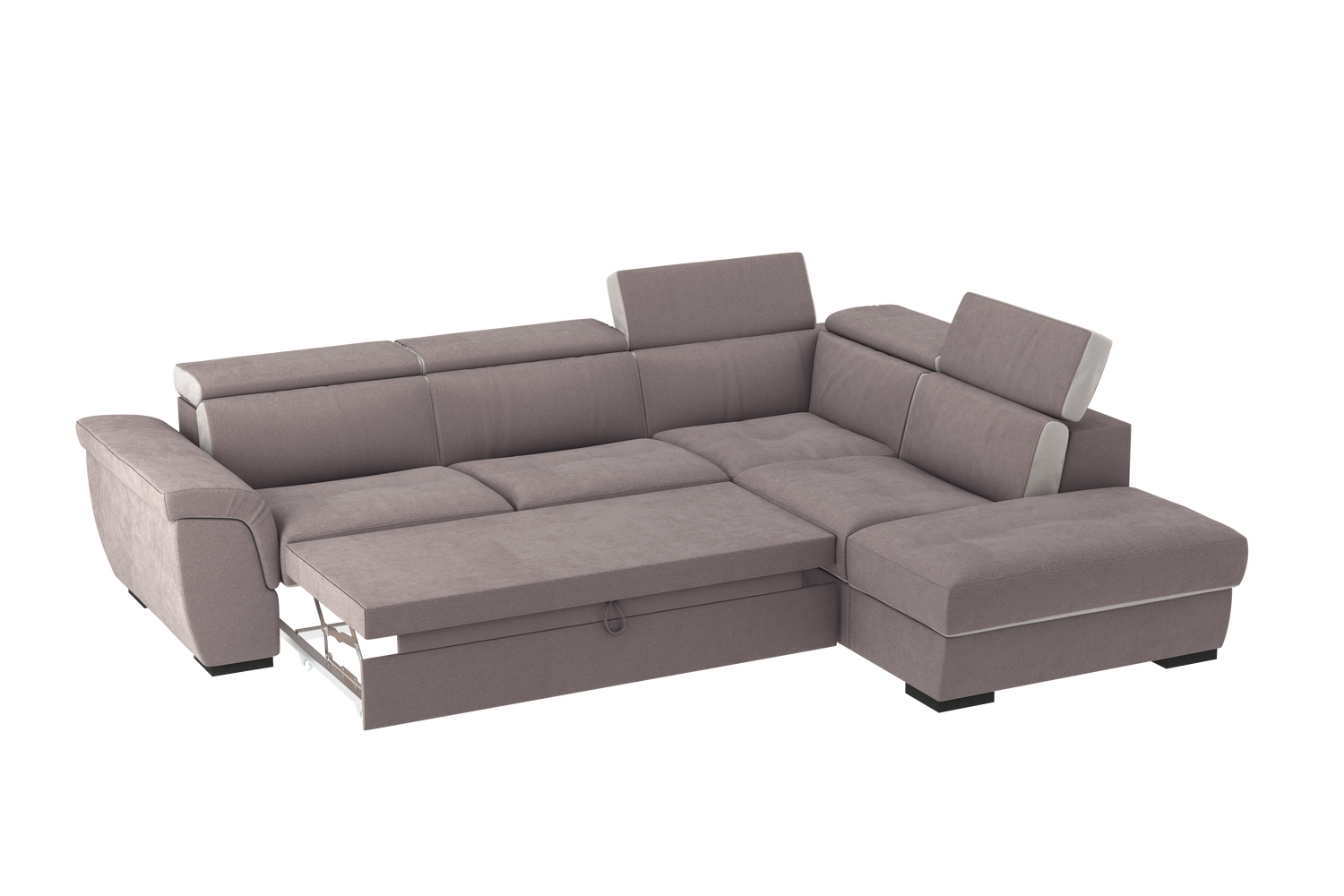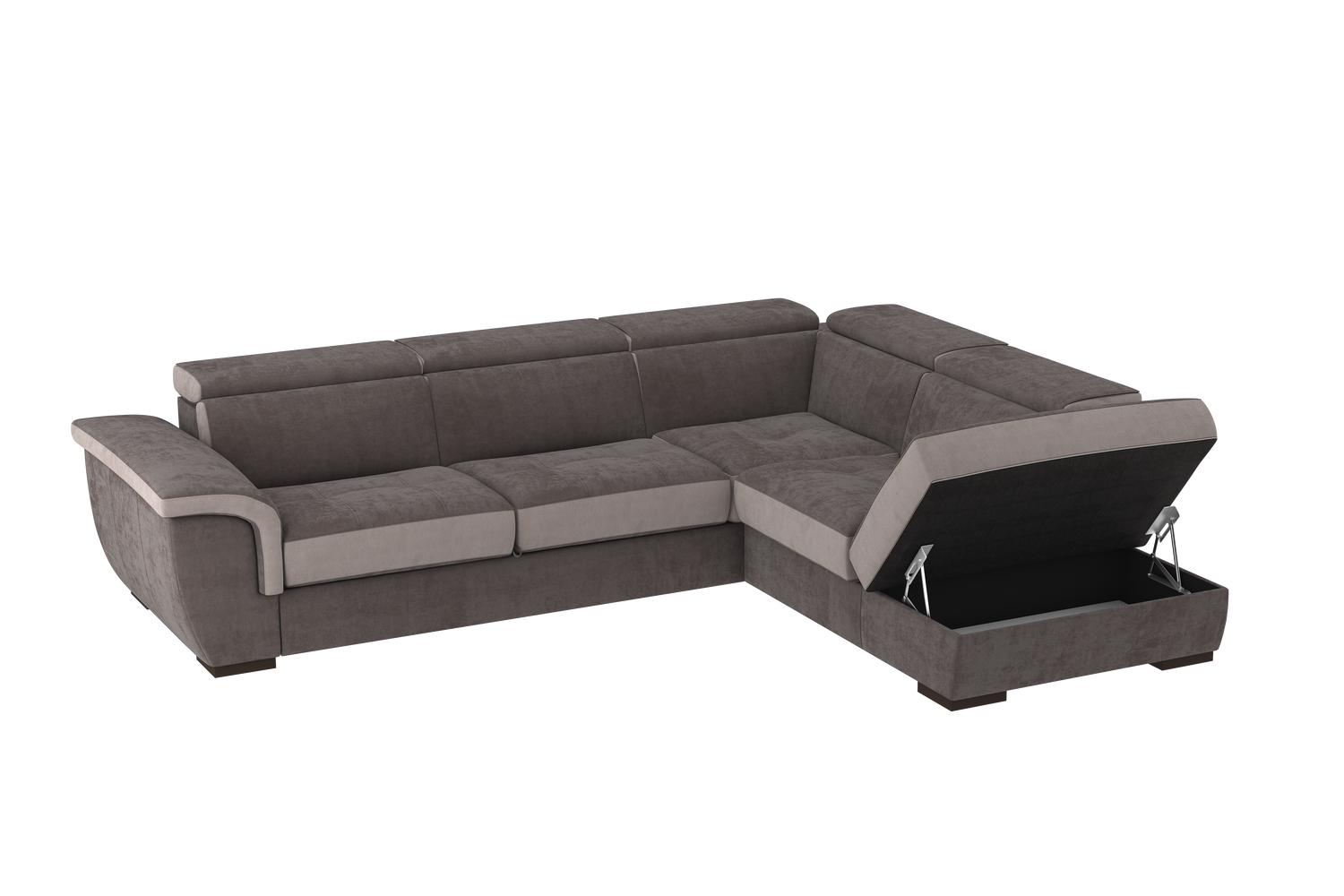 Un divano angolare dallo stile moderno, con un meccanismo inferiore scorrevole che consente di estrarre un ripiano che allineandosi alla seduta crea un comodo letto o un semplice supporto poggiapiedi. Il pouf terminale è un capiente contenitore dove riporre cuscini e quant’altro. Il divano è prodotto con tessuto di alta qualità resistente all’abrasione. Interamente prodotto in UE.