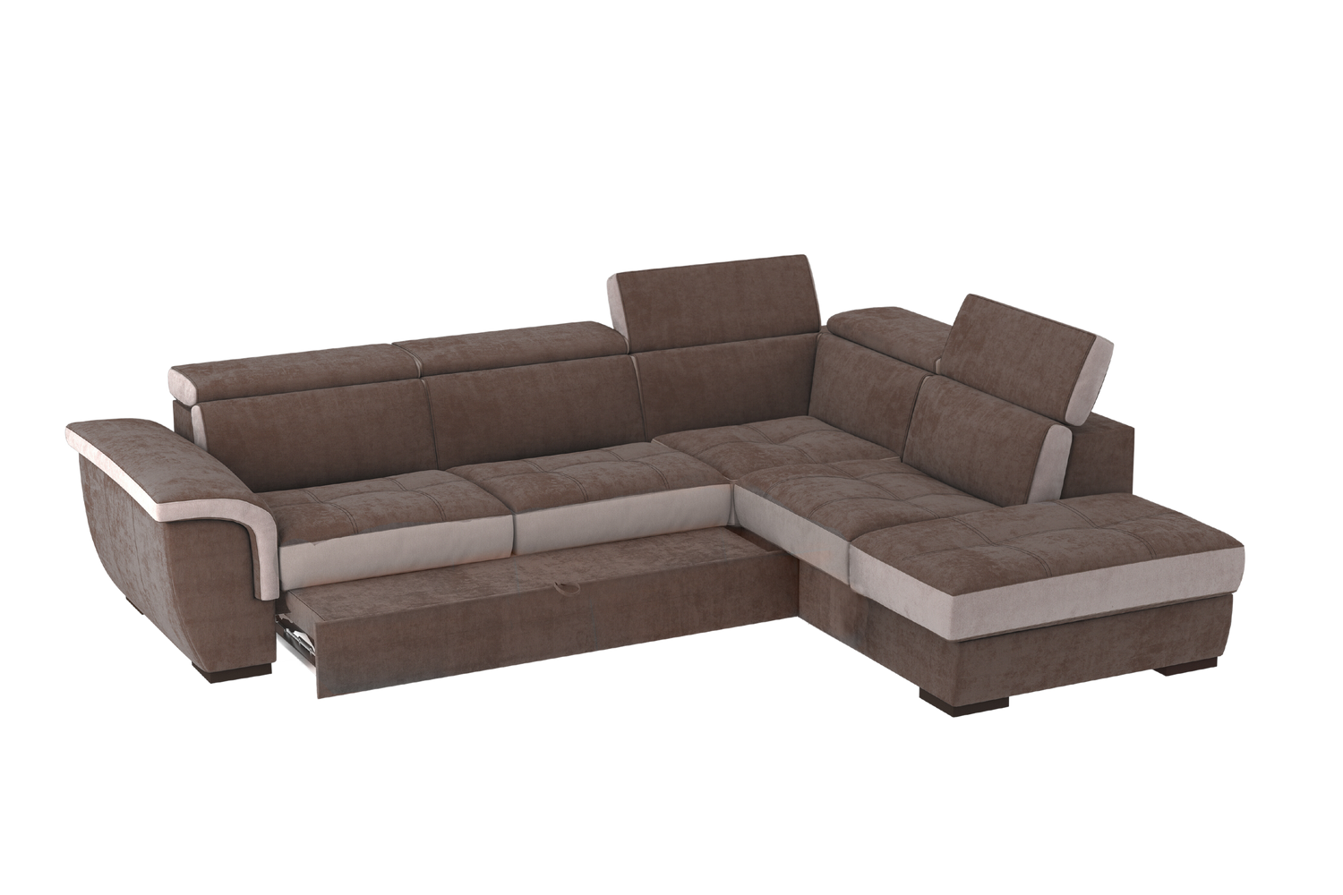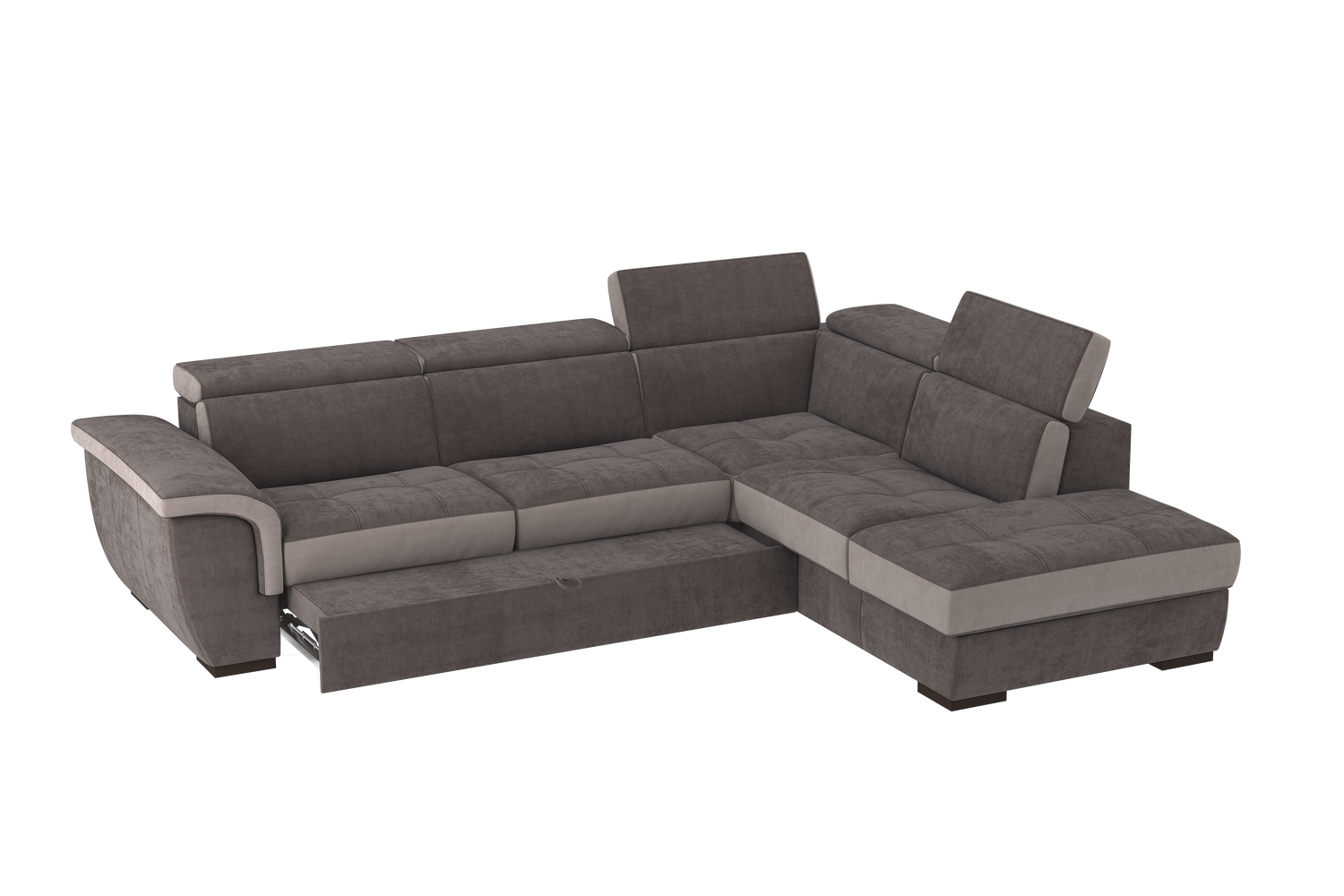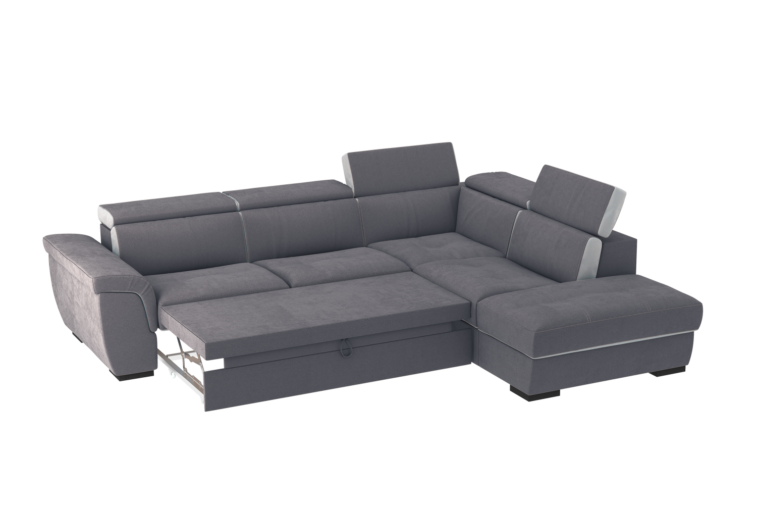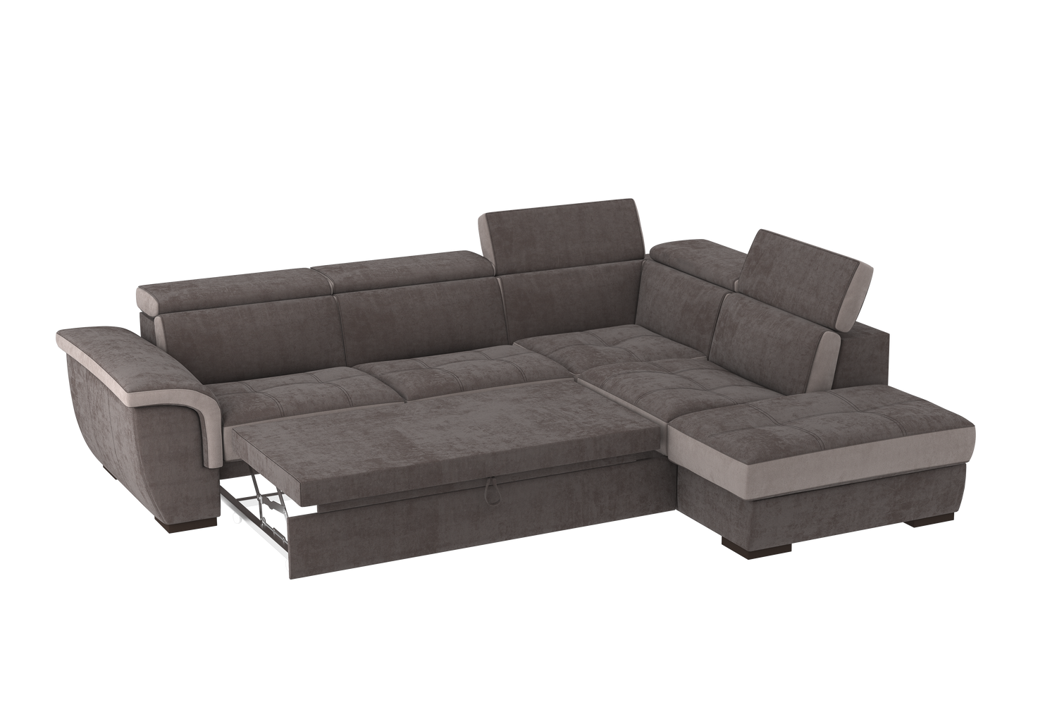Un divano angolare dallo stile moderno, con un meccanismo inferiore scorrevole che consente di estrarre un ripiano che allineandosi alla seduta crea un comodo letto o un semplice supporto poggiapiedi. Il pouf terminale è un capiente contenitore dove riporre cuscini e quant’altro. Il divano è prodotto con tessuto di alta qualità resistente all’abrasione. Interamente prodotto in UE.