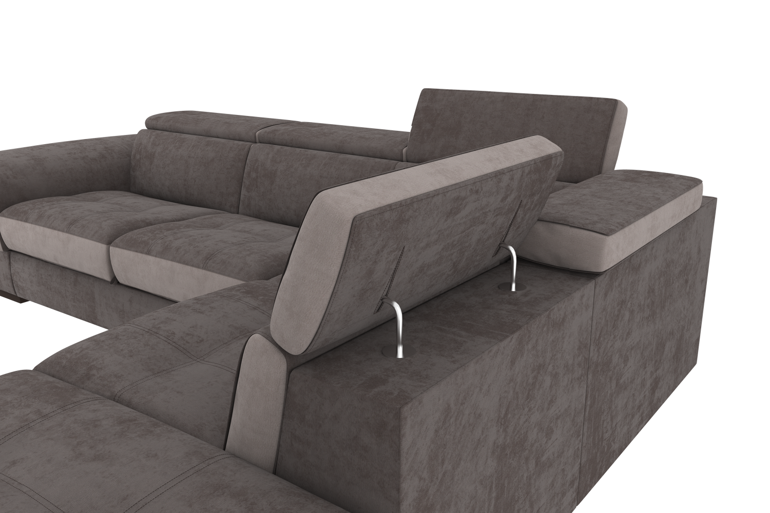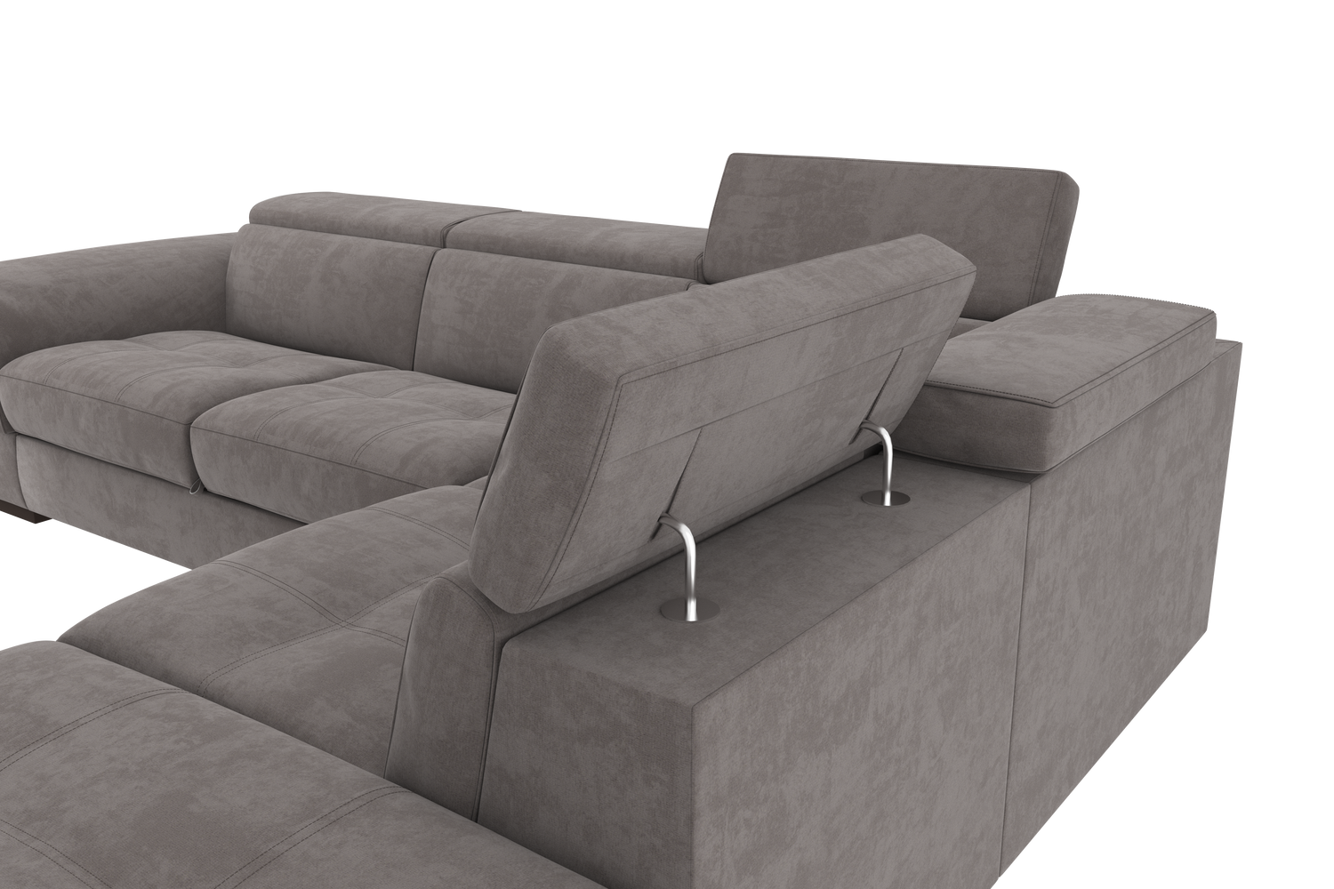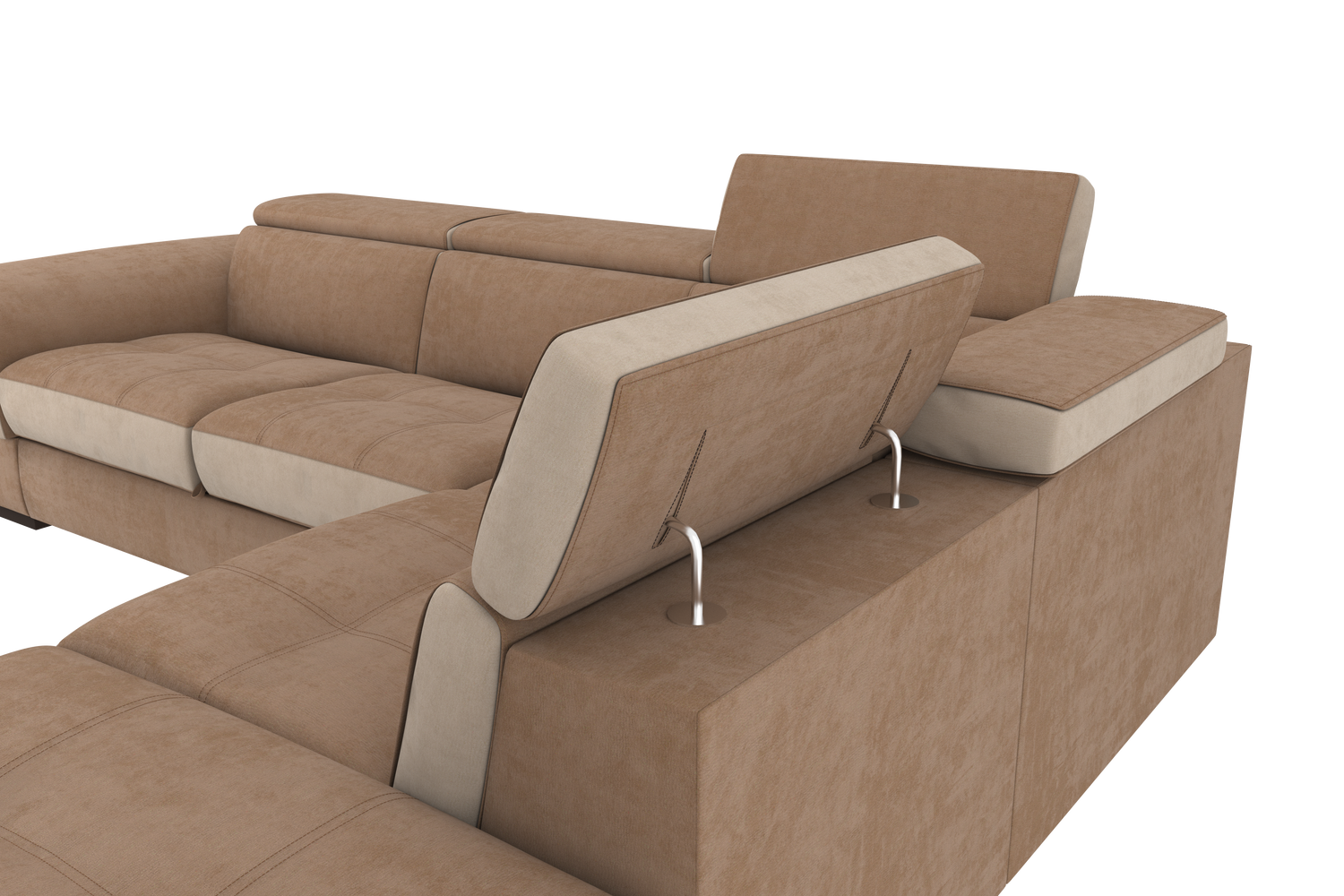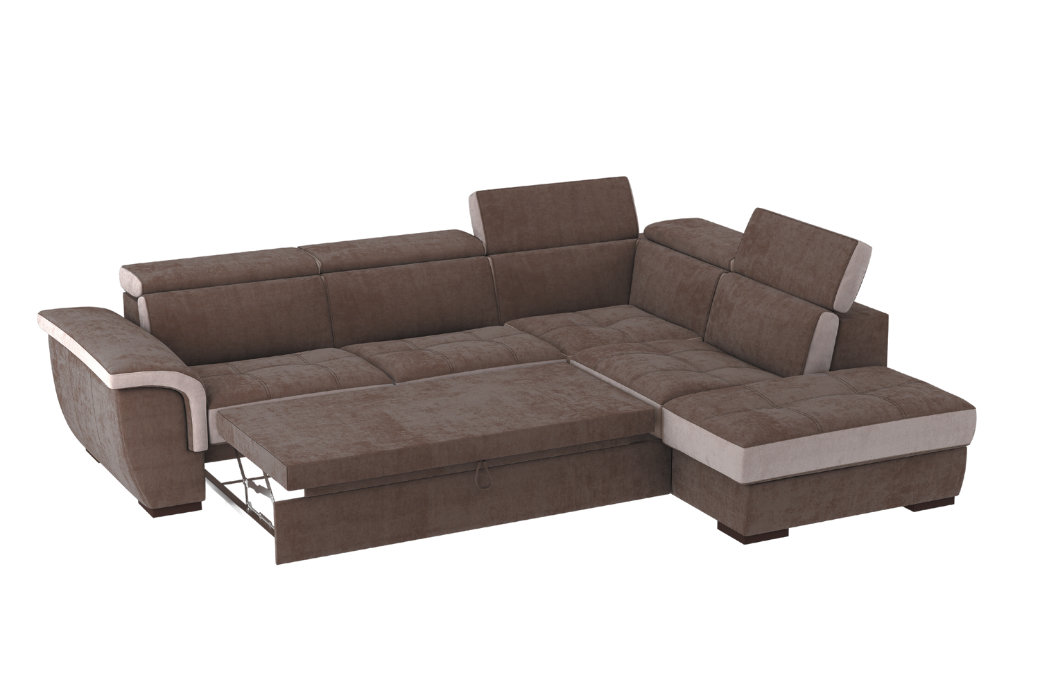 Un divano angolare dallo stile moderno, con un meccanismo inferiore scorrevole che consente di estrarre un ripiano che allineandosi alla seduta crea un comodo letto o un semplice supporto poggiapiedi. Il pouf terminale è un capiente contenitore dove riporre cuscini e quant’altro. Il divano è prodotto con tessuto di alta qualità resistente all’abrasione. Interamente prodotto in UE.