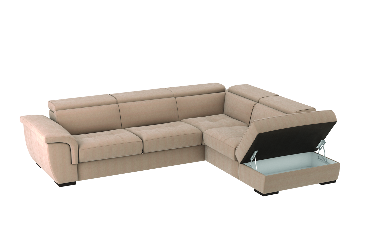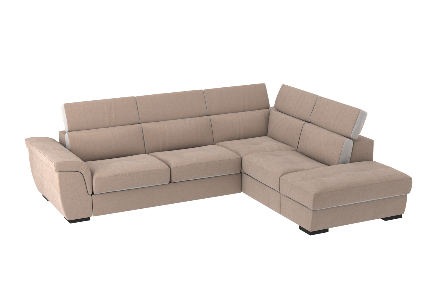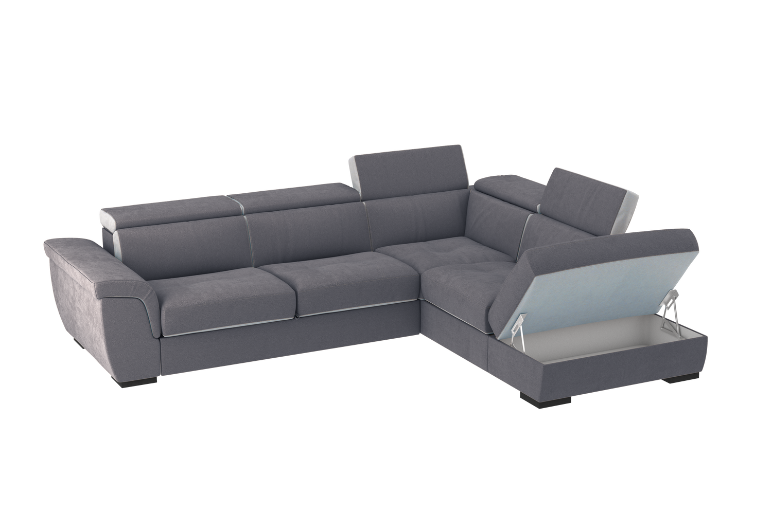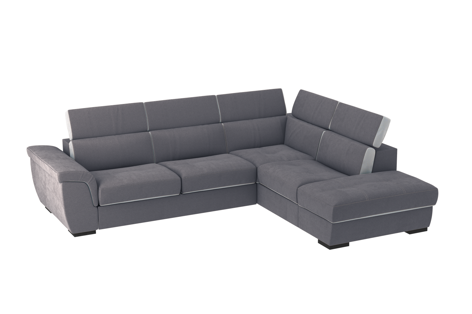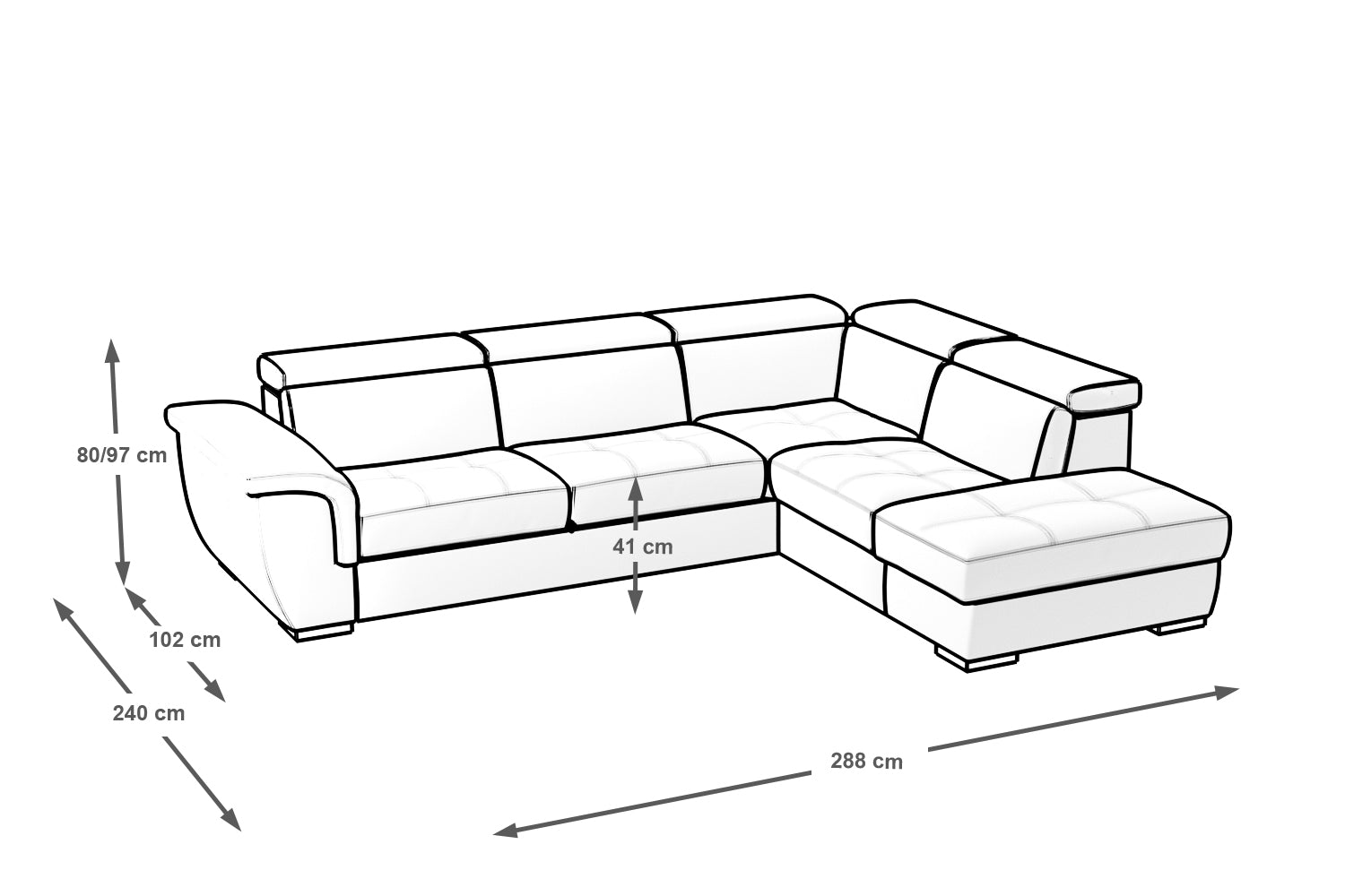- Descrizione prodotto: questo divano angolare è reversibile il che significa che l'angolo puo’ essere posizionato sia a destra che a sinistra del divano. È perfetto per i grandi ambienti ed è esteticamente accattivante. È dotato di materasso ad estrazione complanare adatto per riposare le gambe durante i vostri momenti di relax, oppure a trasformarsi insieme alle sedute ed alla chaise longue in un letto rapido per ospiti dell'ultimo minuto. È dotato di una comodo pouf terminale munito di un ampio contenitore interno utile a riporre cuscini, coperte, giocattoli e quant'altro. Le sue dimensioni massime d'ingombro sono 288x240cm e le sedute sono profonde ben 58cm. area letto 210x118cm. È dotato di comodi poggiatesta regolabili in diverse posizioni fino a quella verticale.