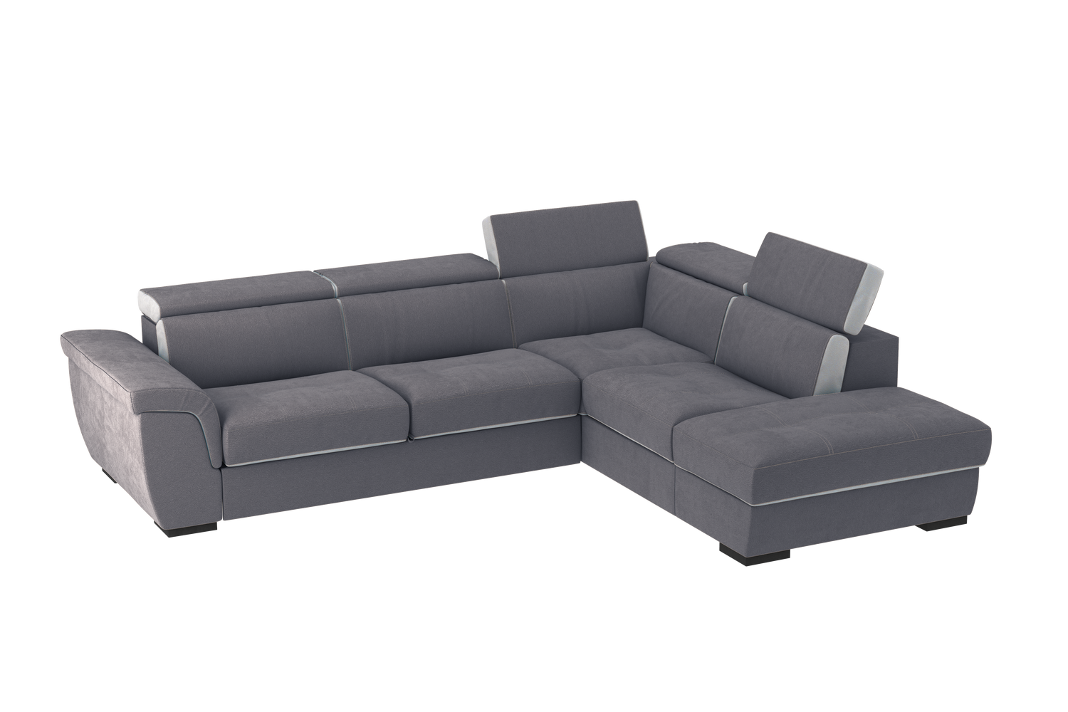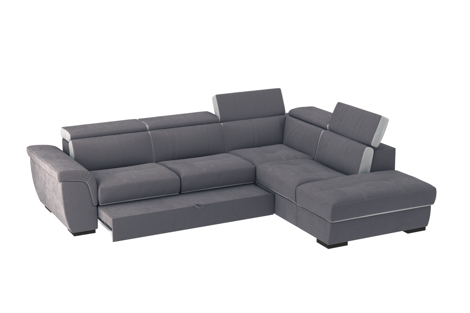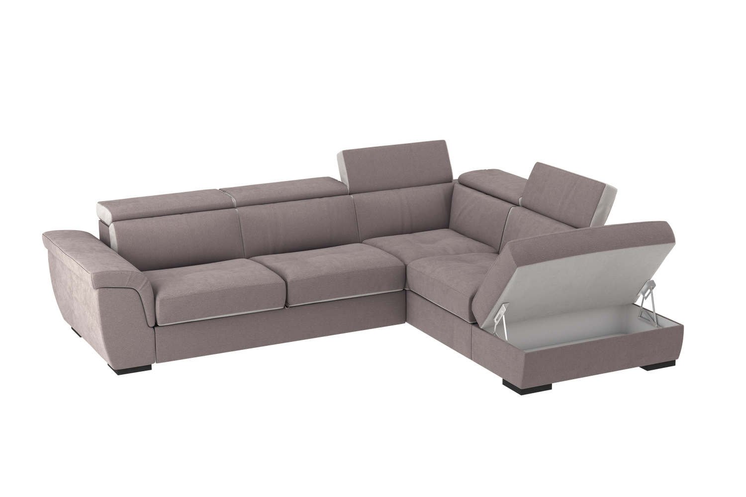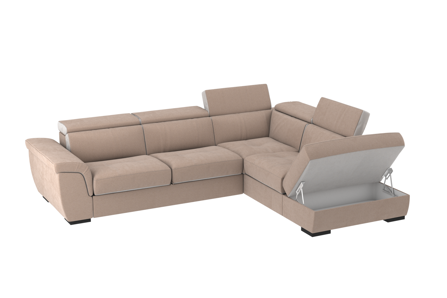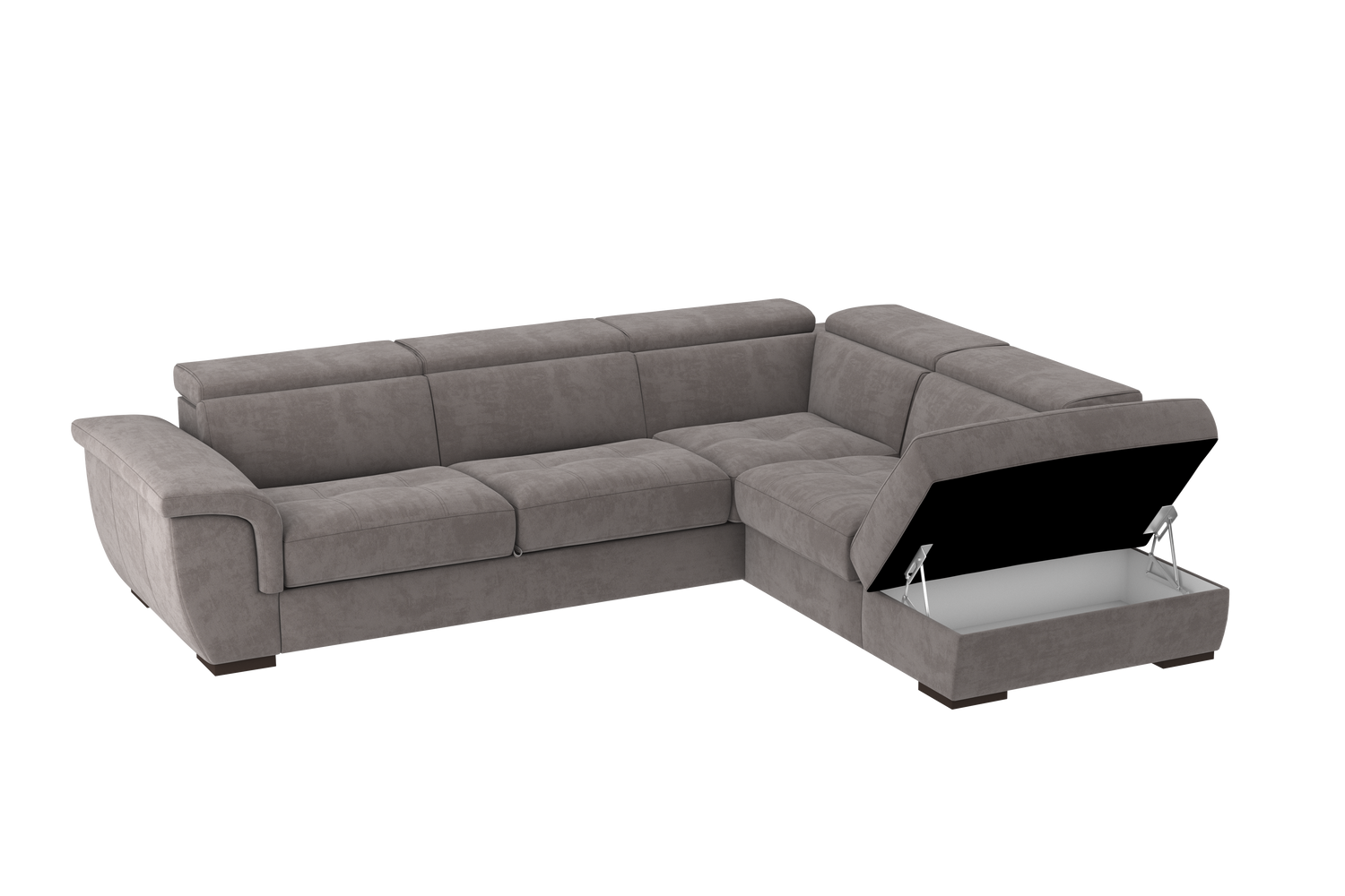 - Descrizione prodotto: questo divano angolare è reversibile il che significa che l'angolo puo’ essere posizionato sia a destra che a sinistra del divano. È perfetto per i grandi ambienti ed è esteticamente accattivante. È dotato di materasso ad estrazione complanare adatto per riposare le gambe durante i vostri momenti di relax, oppure a trasformarsi insieme alle sedute ed alla chaise longue in un letto rapido per ospiti dell'ultimo minuto. È dotato di una comodo pouf terminale munito di un ampio contenitore interno utile a riporre cuscini, coperte, giocattoli e quant'altro. Le sue dimensioni massime d'ingombro sono 288x240cm e le sedute sono profonde ben 58cm. area letto 210x118cm. È dotato di comodi poggiatesta regolabili in diverse posizioni fino a quella verticale.