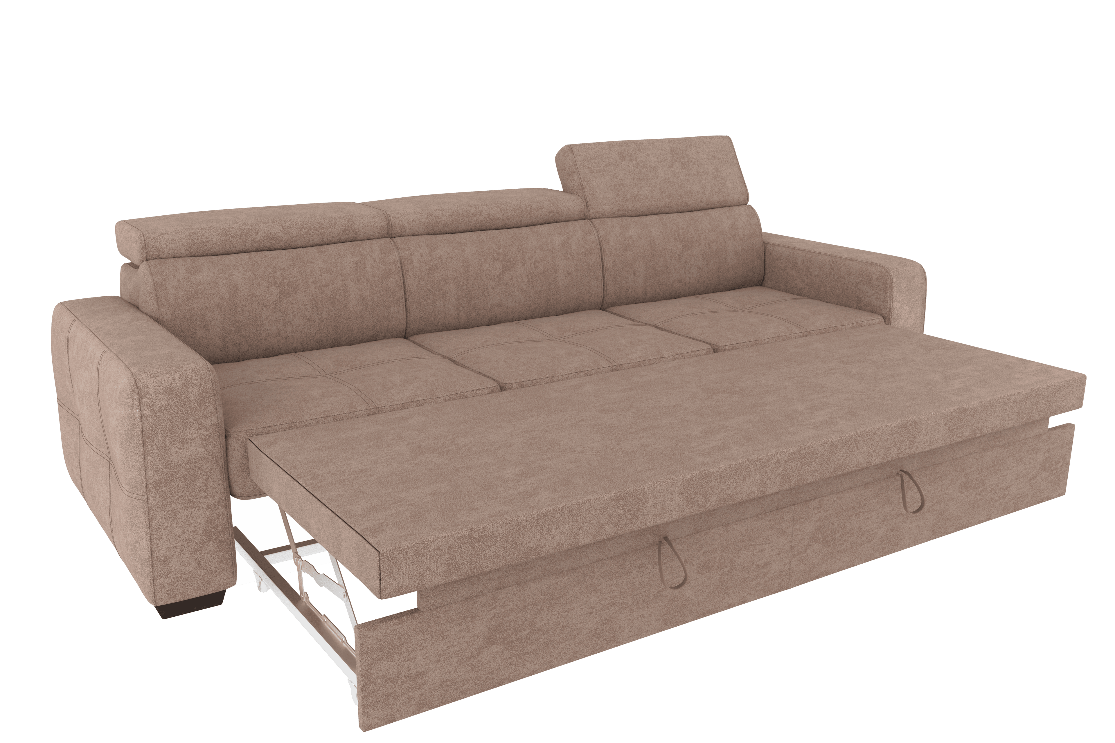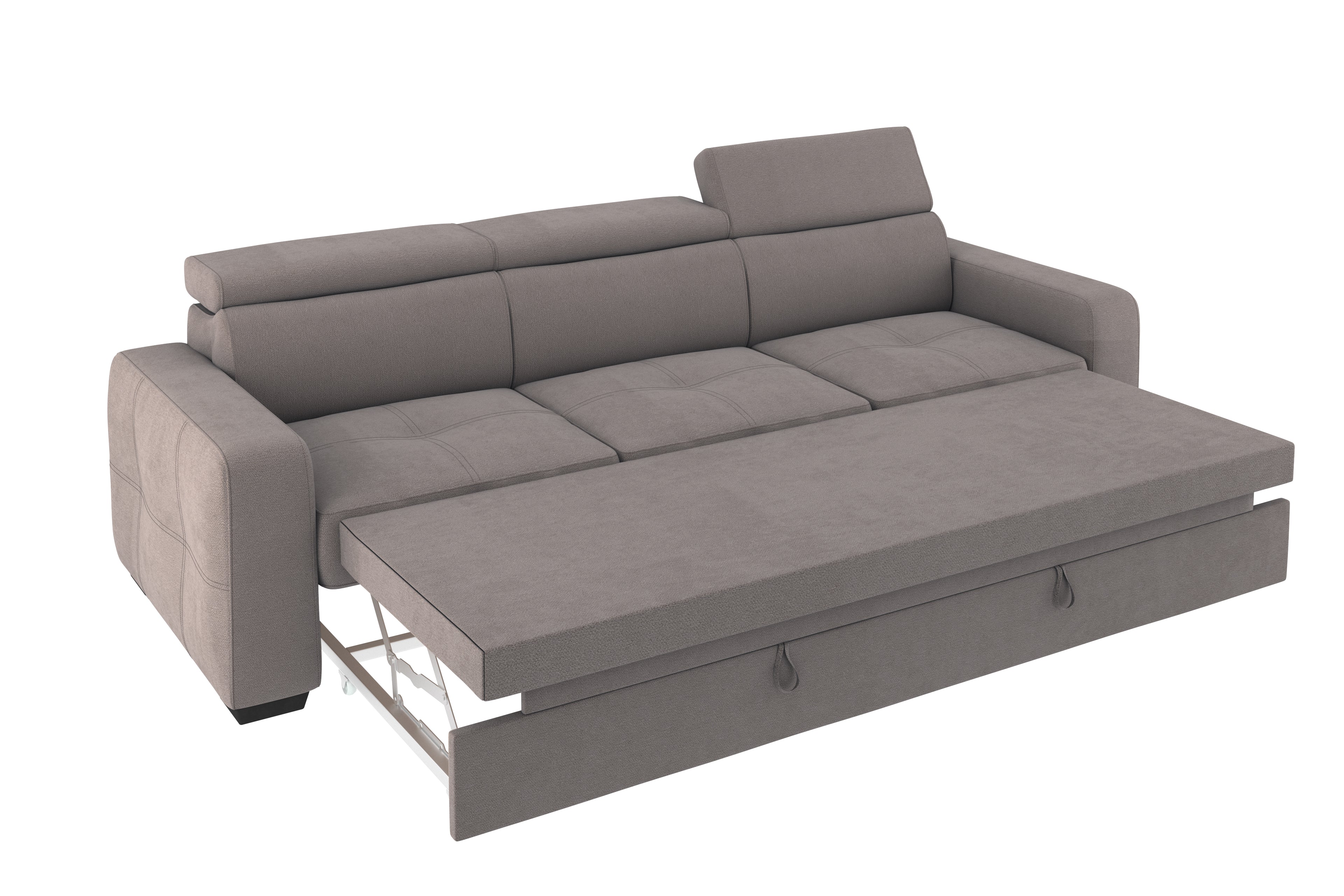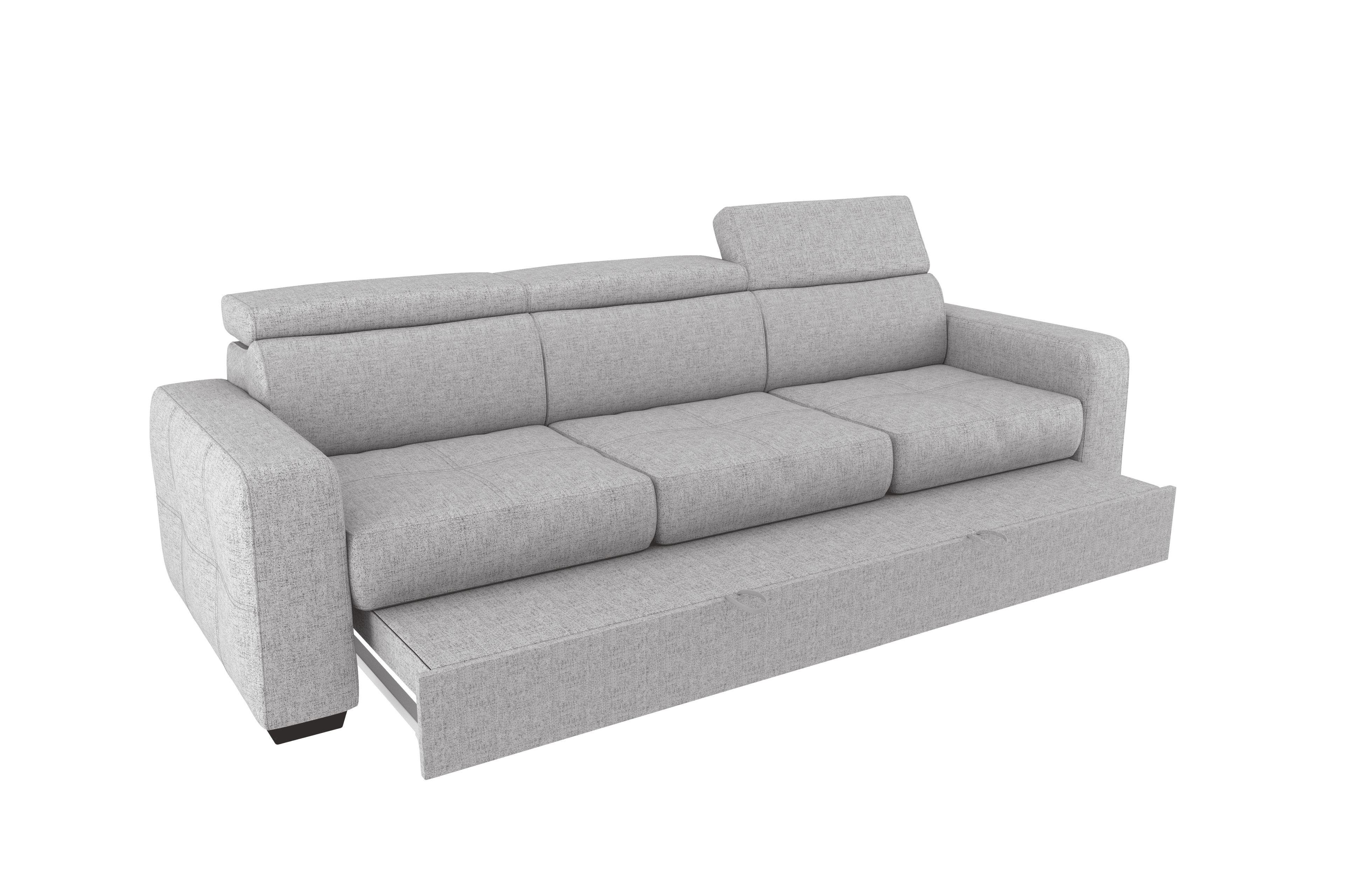 Un divano 3 posti con grande pouf estraibile dallo stile moderno e dalle dimensioni generose. Il un meccanismo inferiore scorrevole, consente di estrarre un ripiano che allineandosi alla seduta crea un’ampia superfice letto. Il divano è prodotto con tessuto di alta qualità resistente all’abrasione. Interamente prodotto in UE.