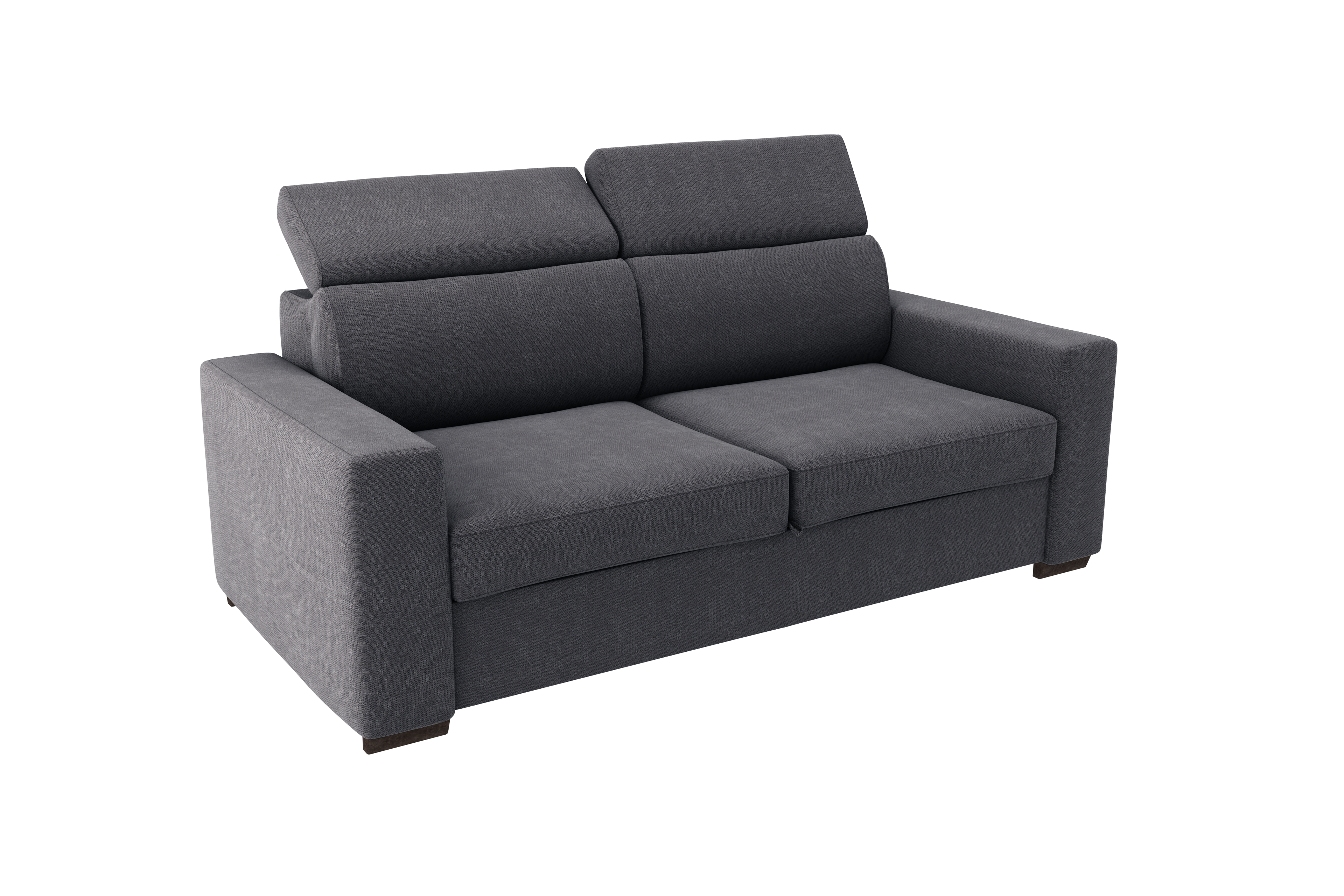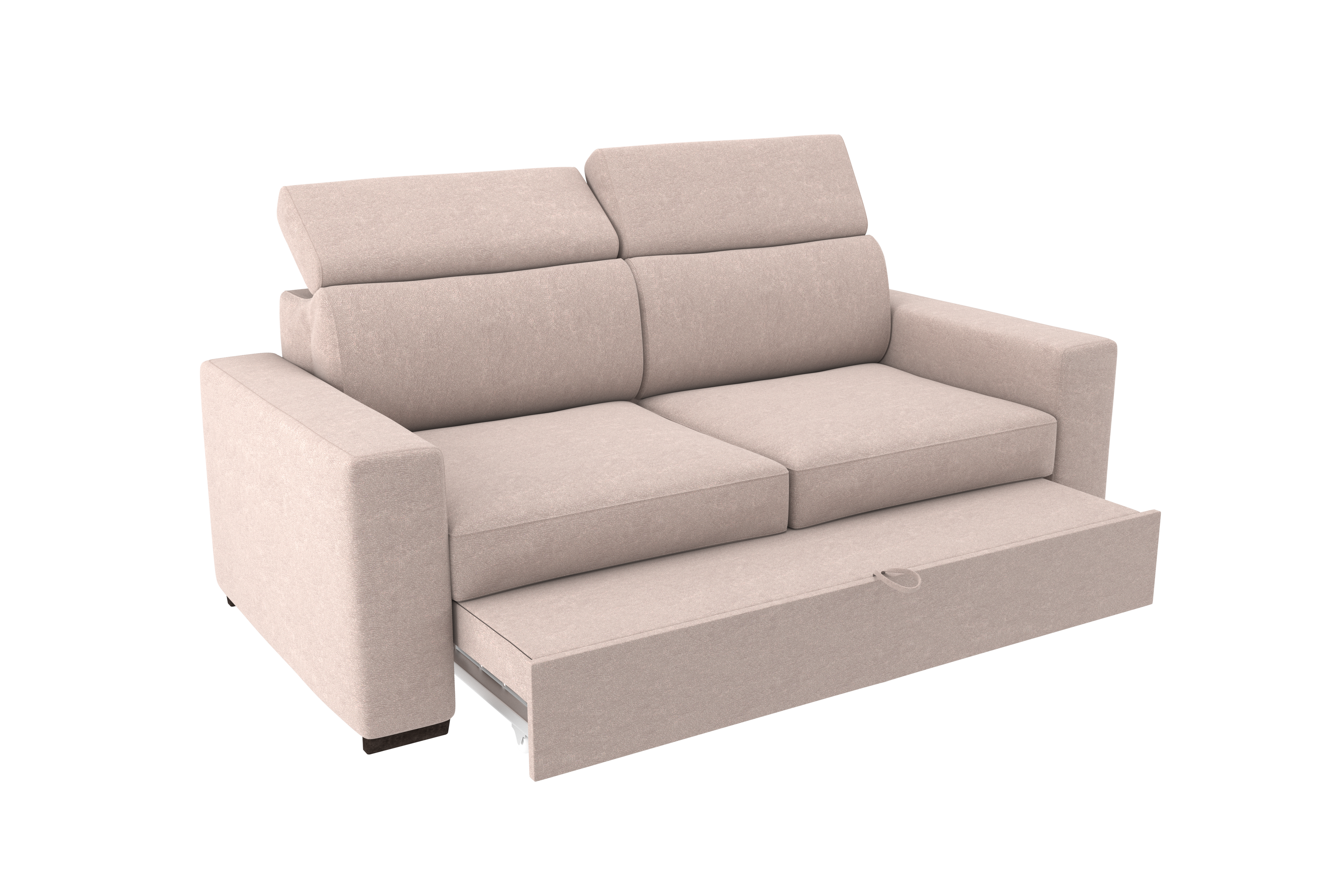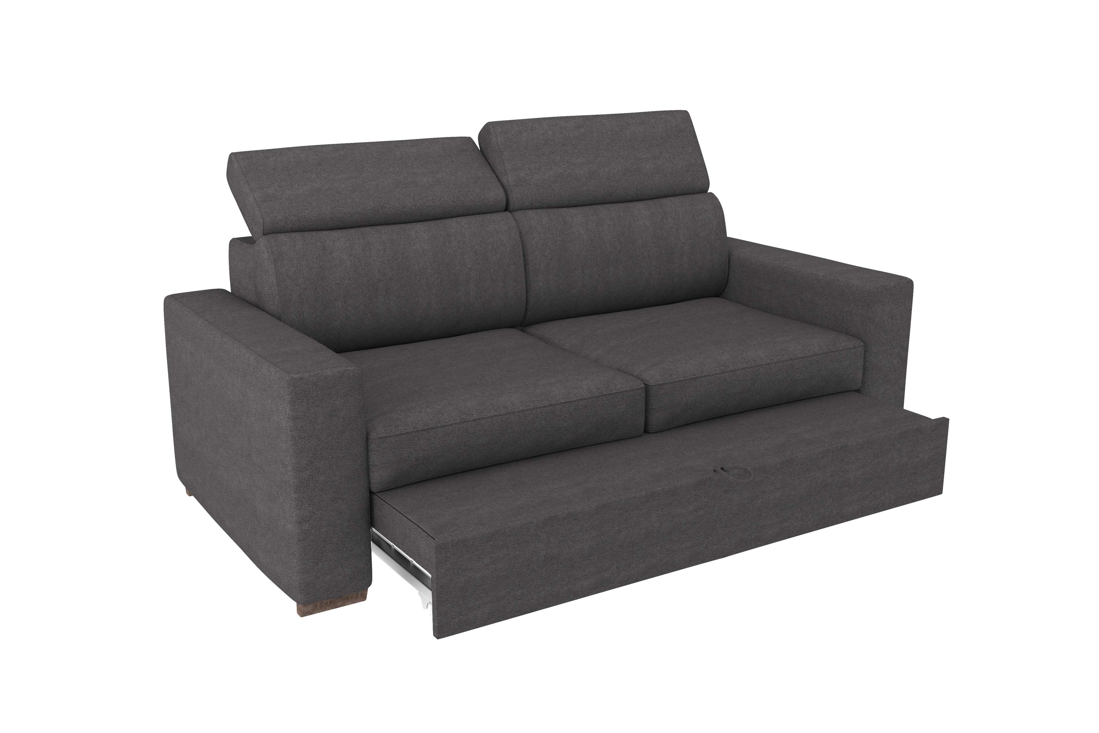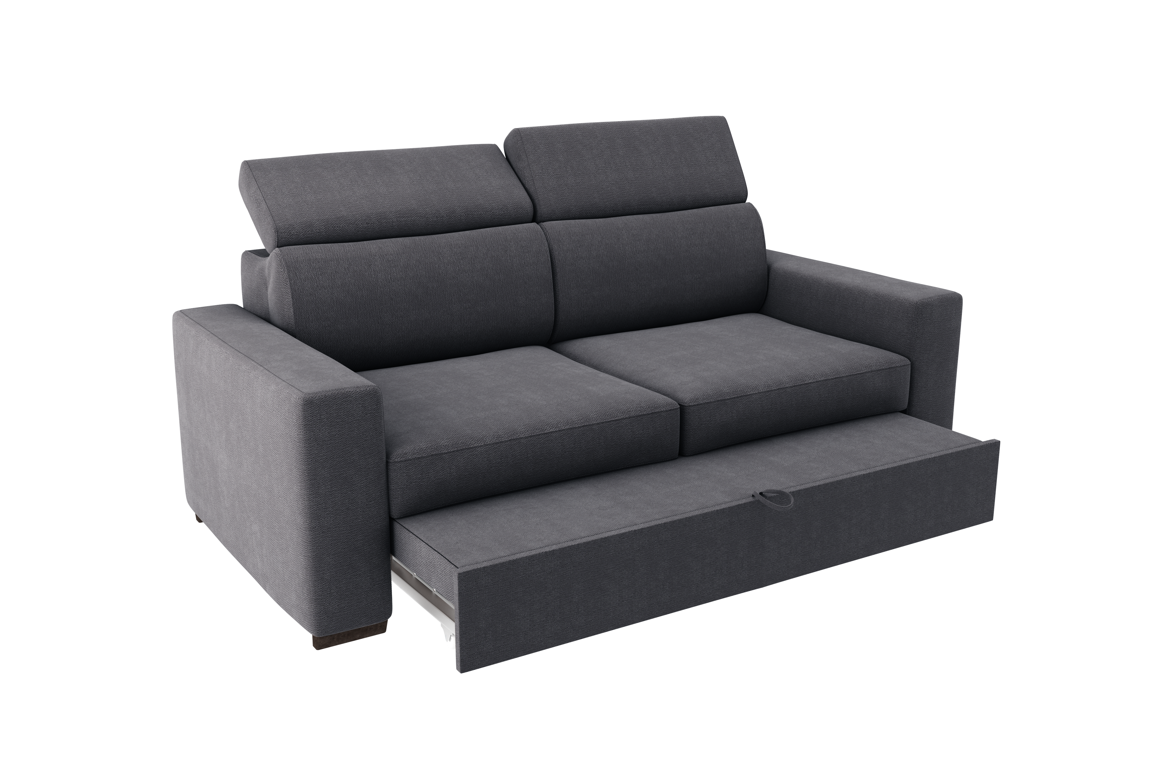 A 2-seater sofa with pull-out pouf with a modern style and small dimensions. The lower sliding mechanism allows you to extract a shelf which, aligning itself with the seat, creates a comfortable footrest support or a small bed shelf for children. The sofa is made of high quality abrasion resistant fabric. Entirely produced in the EU.