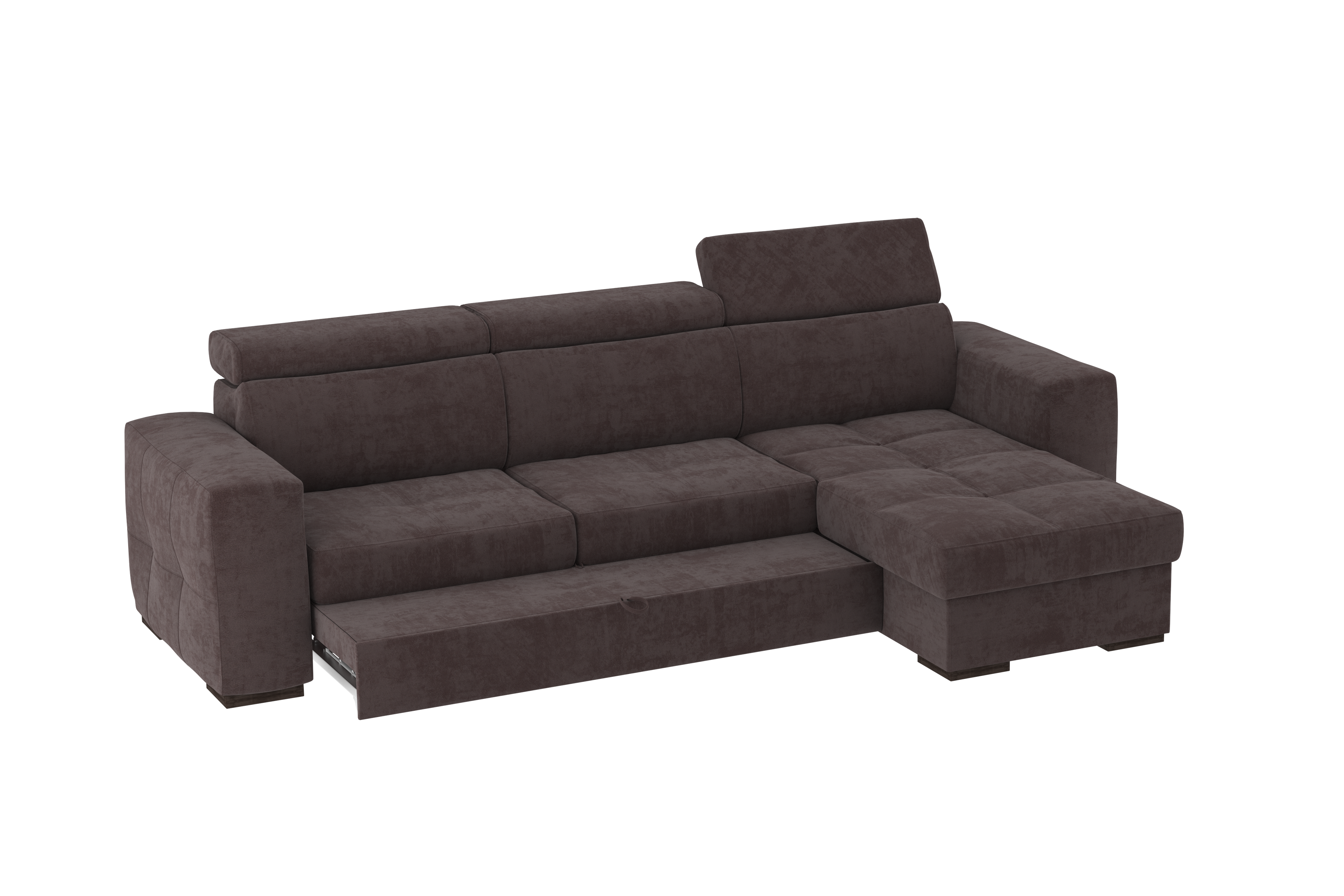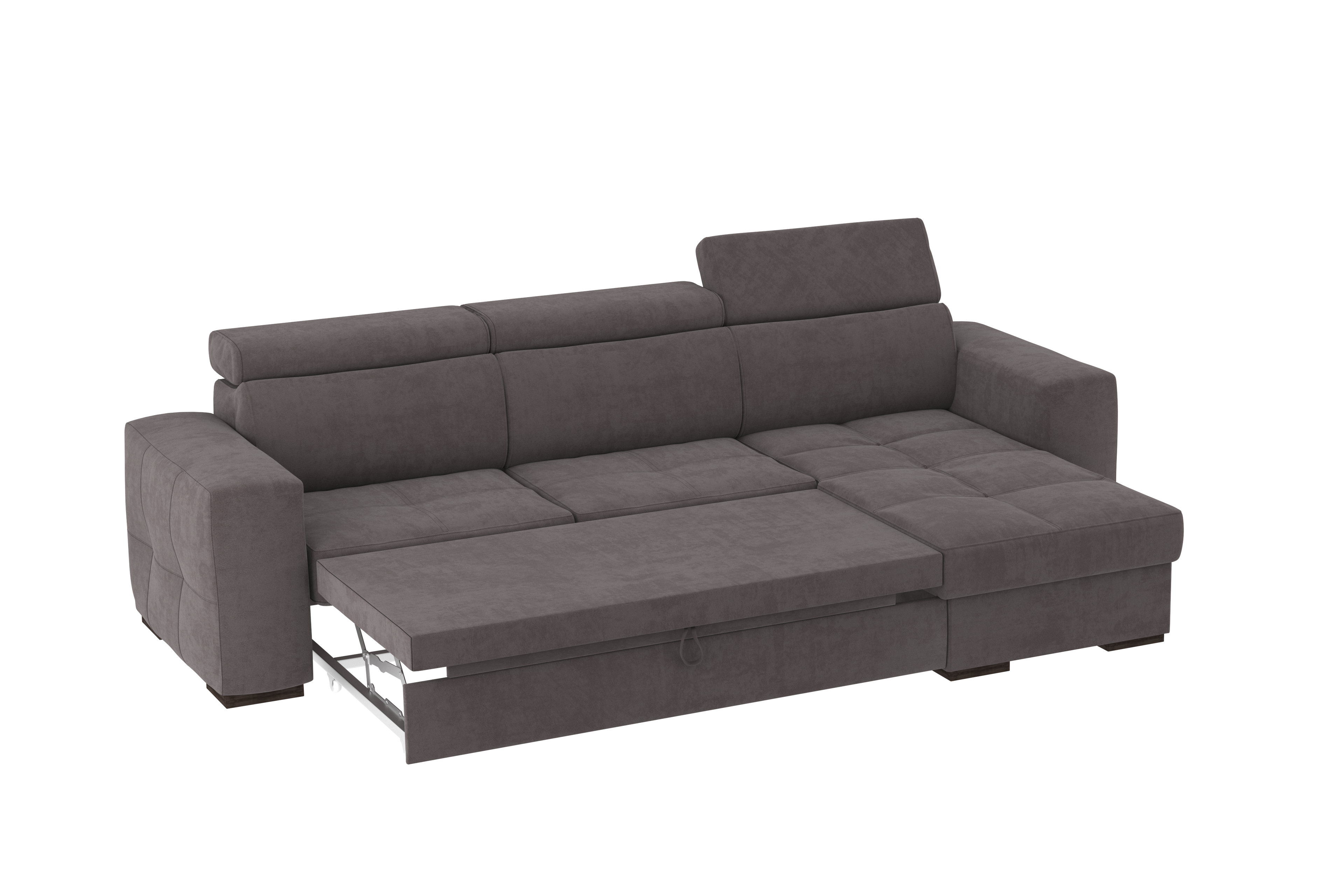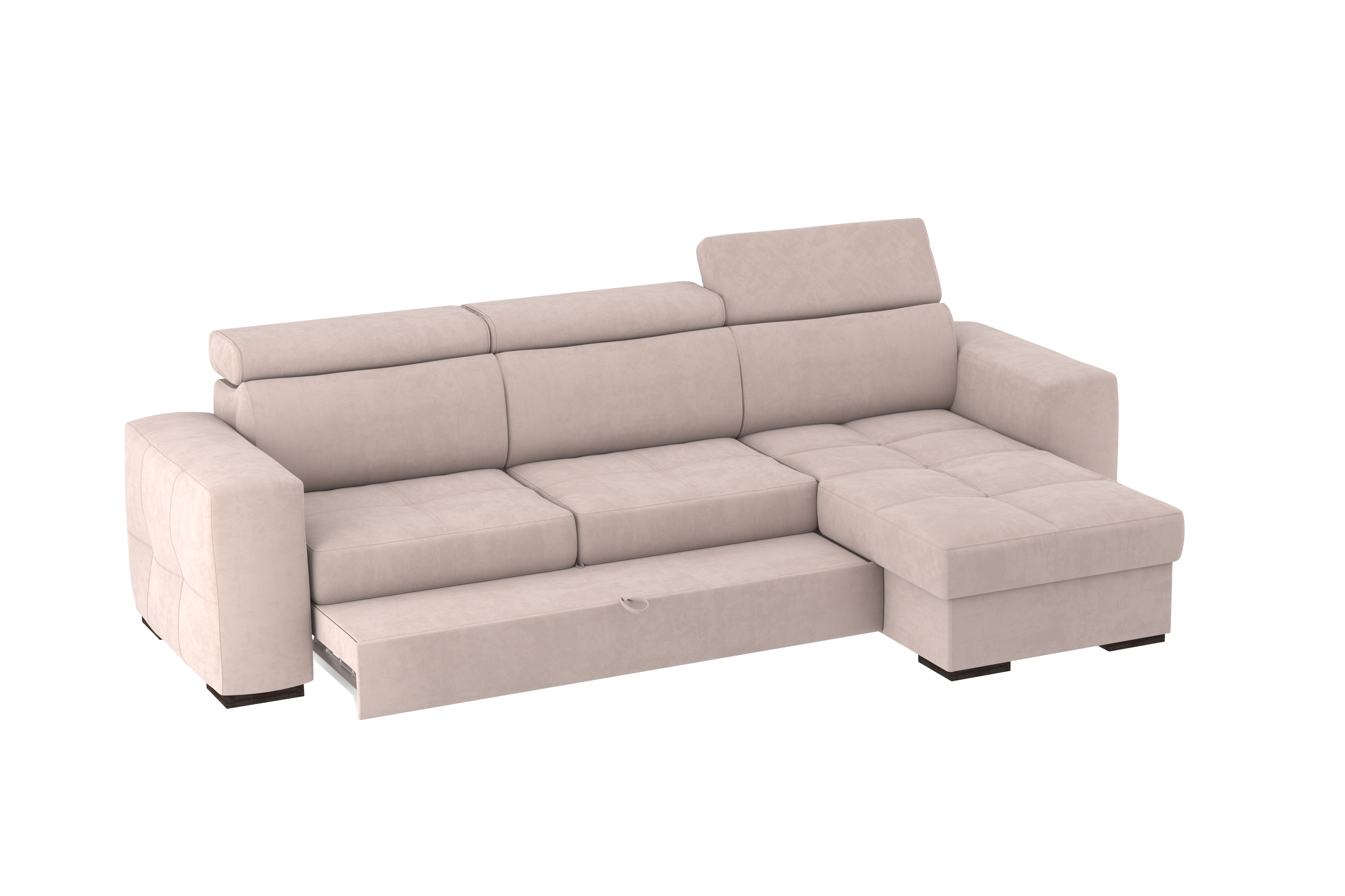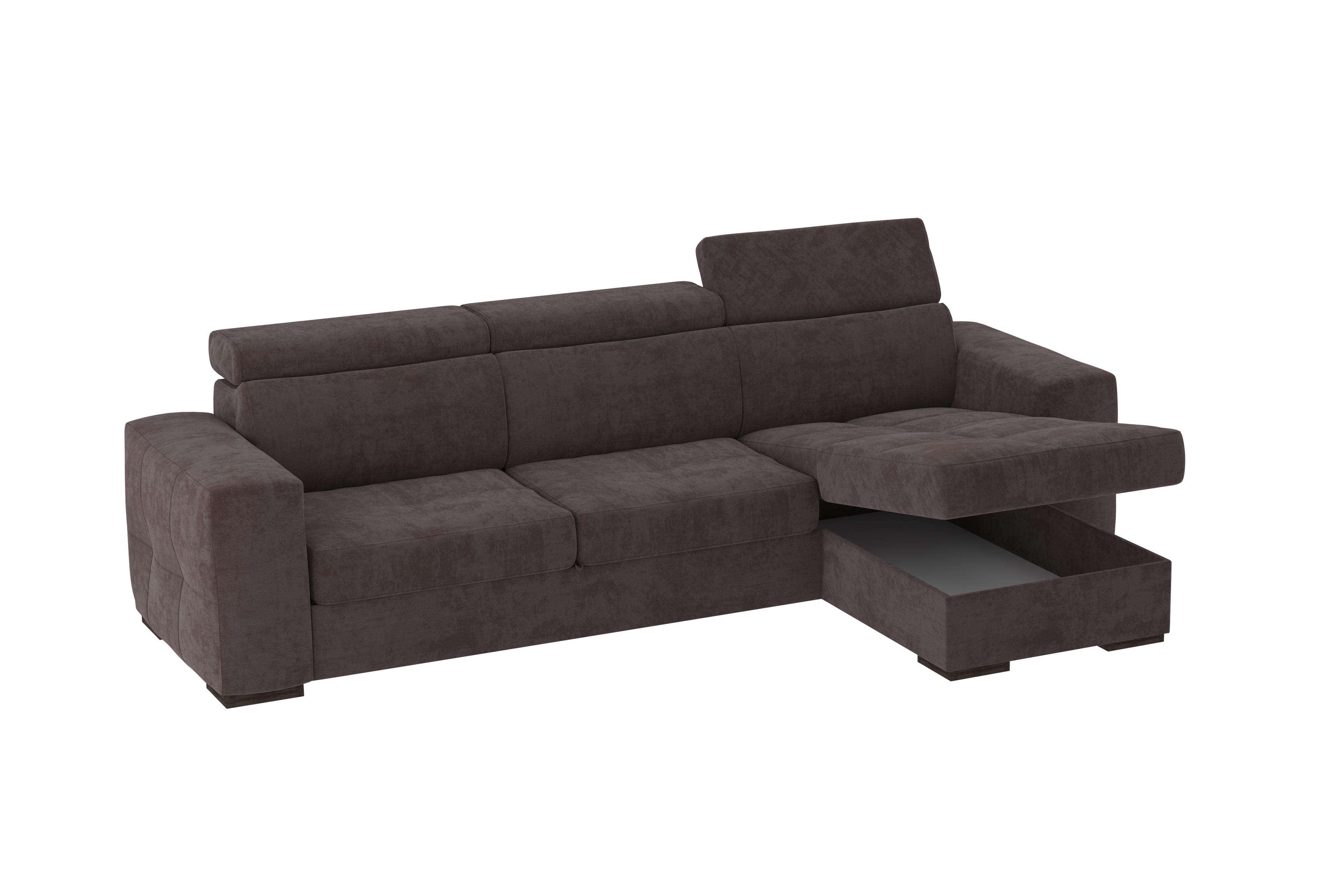 Un divano con chaise longue dalle dimensioni generose con uno stile moderno. Il suo meccanismo inferiore scorrevole consente di estrarre un ripiano che allineandosi alla seduta, crea un comodo letto o un semplice supporto poggiapiedi. La chaise longue è un capiente contenitore dove riporre cuscini e quant’altro. Il divano è prodotto con tessuto di alta qualità resistente all’abrasione. Interamente prodotto in UE.