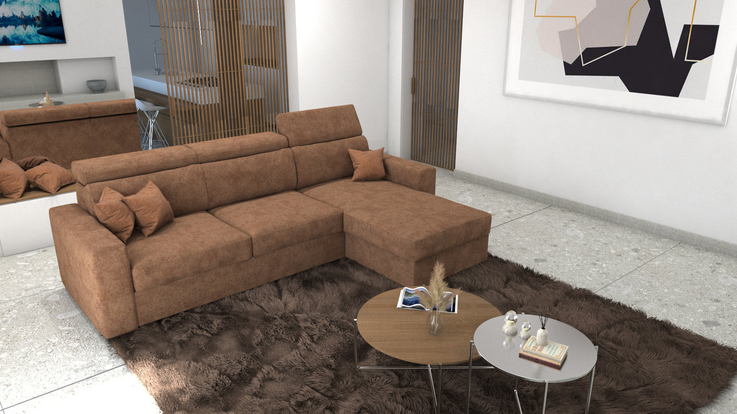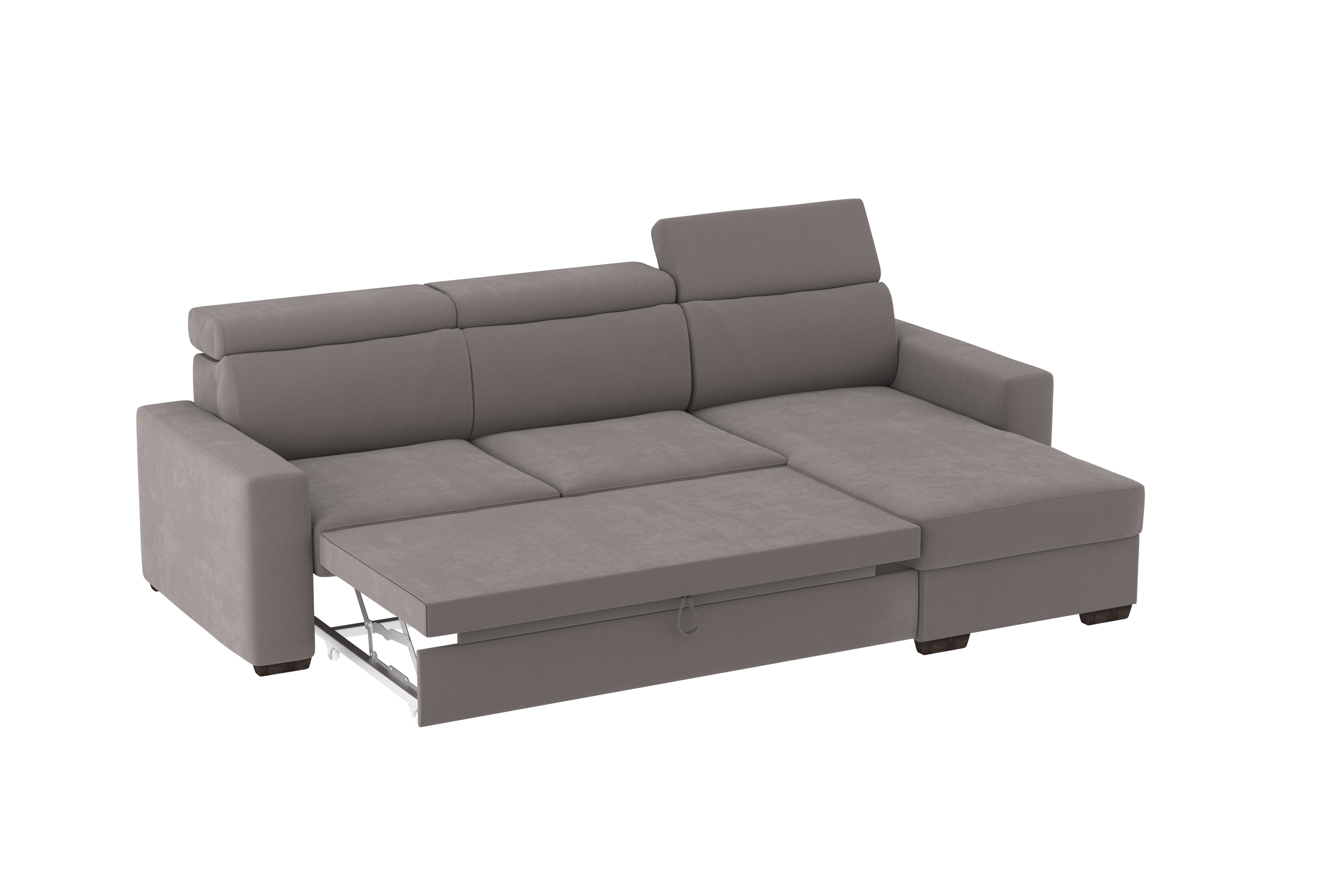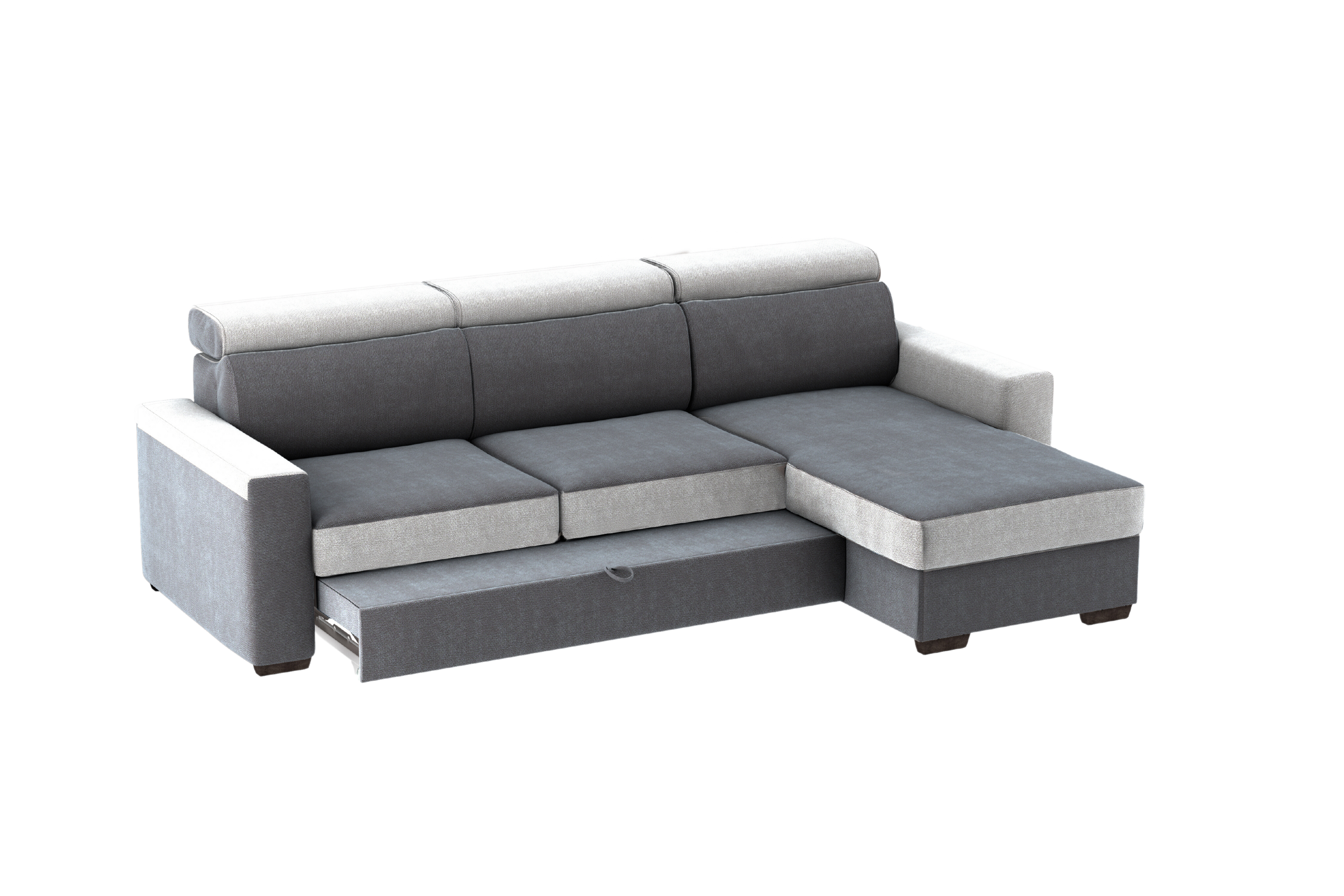 Un divano 2 posti con chaise longue dallo stile moderno, con un meccanismo inferiore scorrevole che consente di estrarre un ripiano che allineandosi alla seduta crea un comodo letto o un semplice supporto poggiapiedi. La chaise longue è un capiente contenitore dove riporre cuscini e quant’altro. Il divano è prodotto con tessuto di alta qualità resistente all’abrasione. Interamente prodotto in UE.