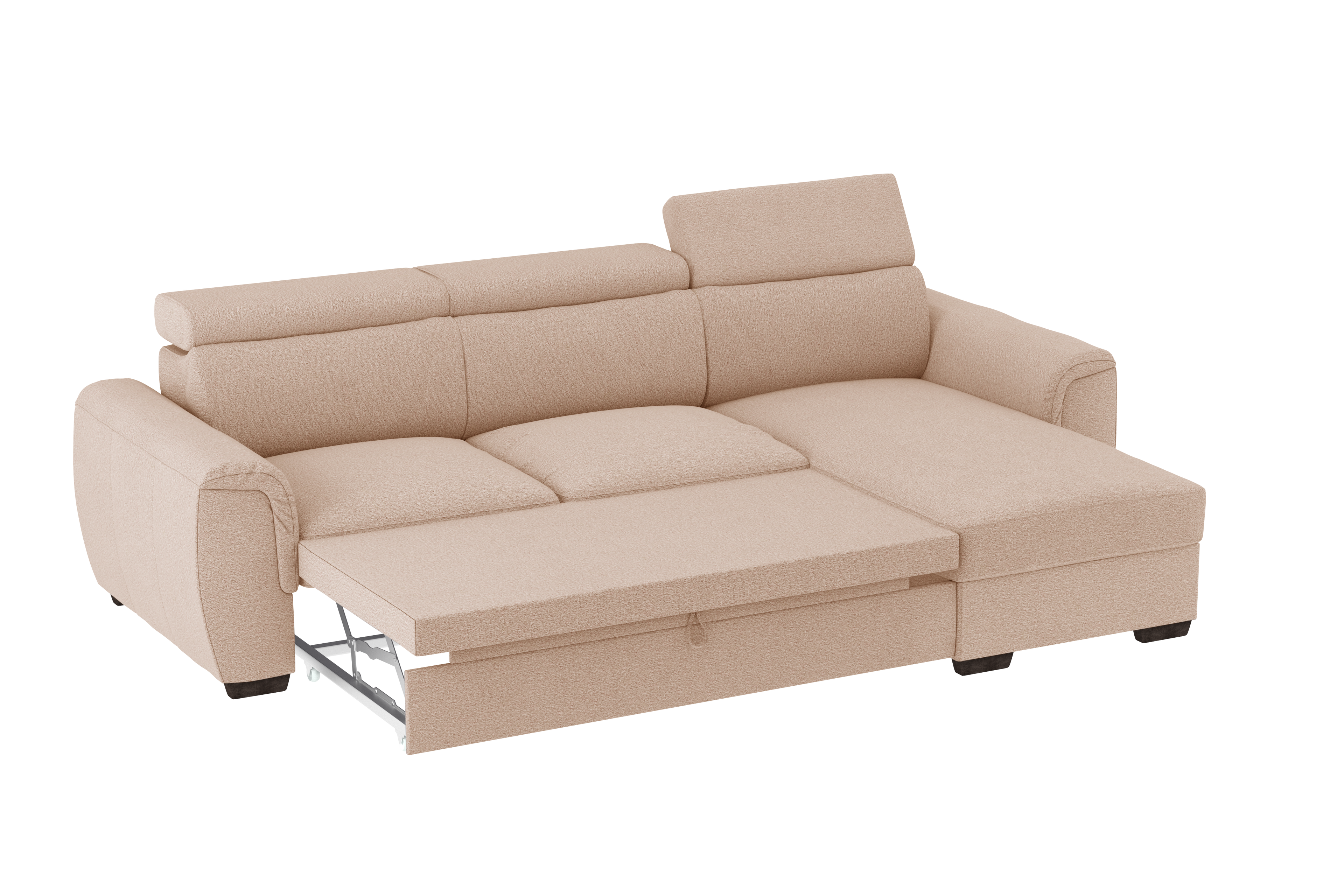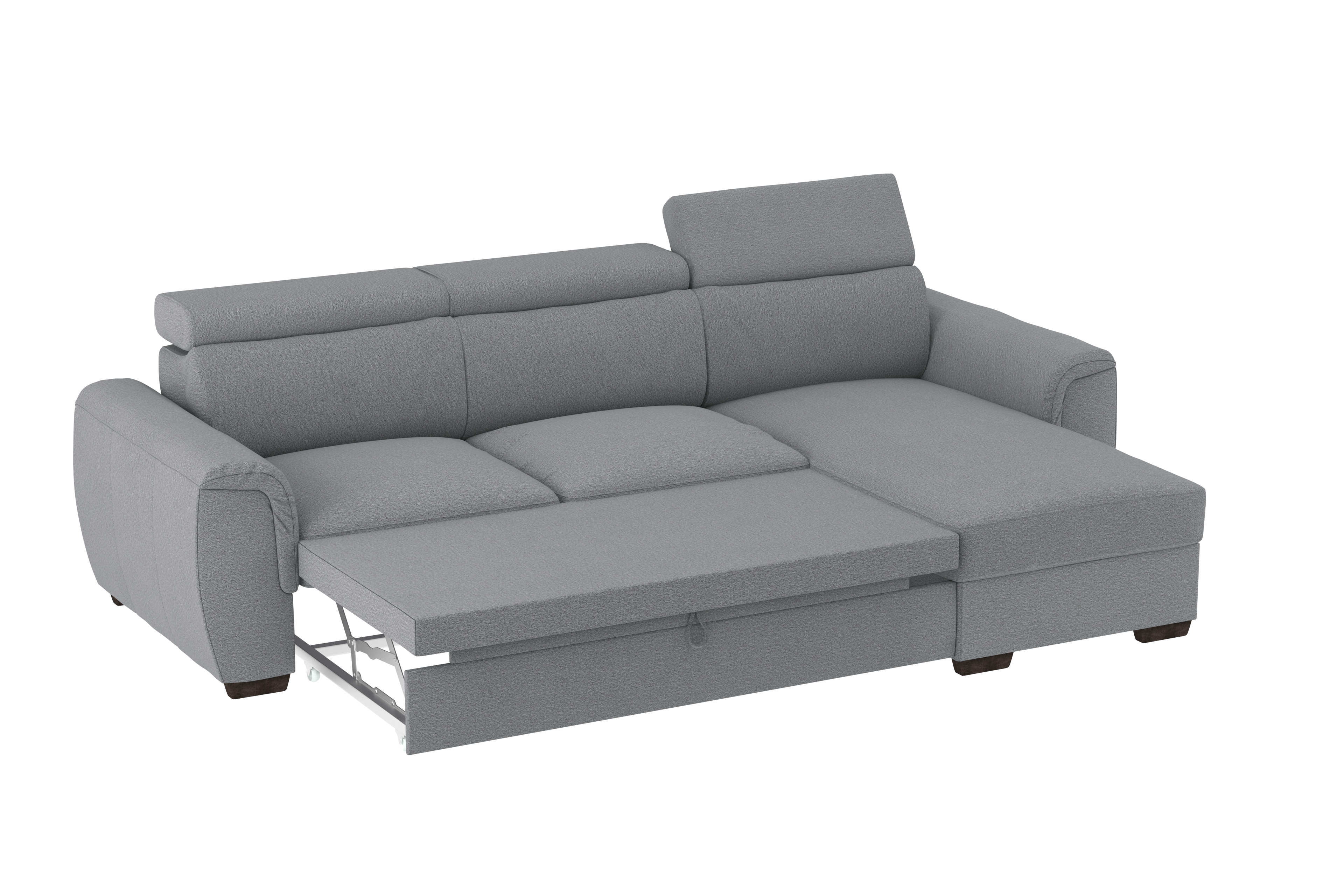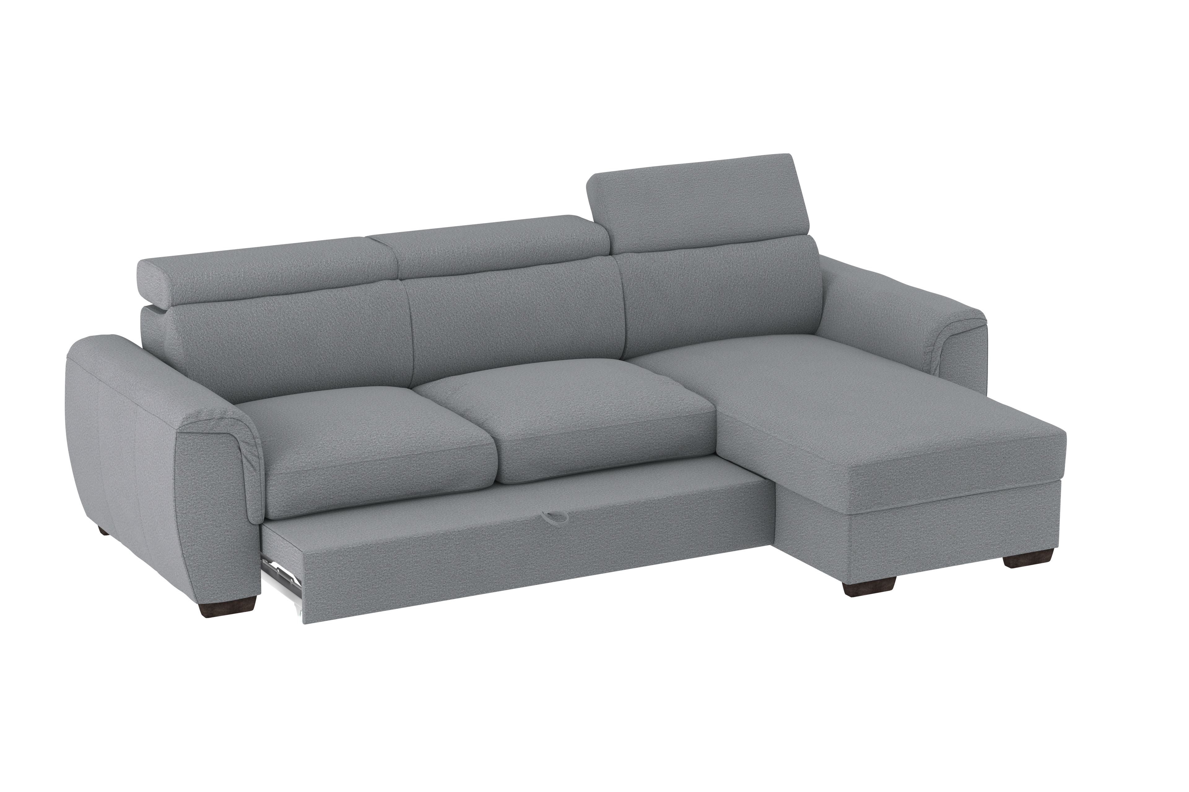 Un divano 2 posti con chaise longue dallo stile moderno, con un meccanismo inferiore scorrevole che consente di estrarre un ripiano che allineandosi alla seduta crea un comodo letto o un semplice supporto poggiapiedi. La chaise longue è un capiente contenitore dove riporre cuscini e quant’altro. Il divano è prodotto con tessuto di alta qualità resistente all’abrasione. Interamente prodotto in UE.